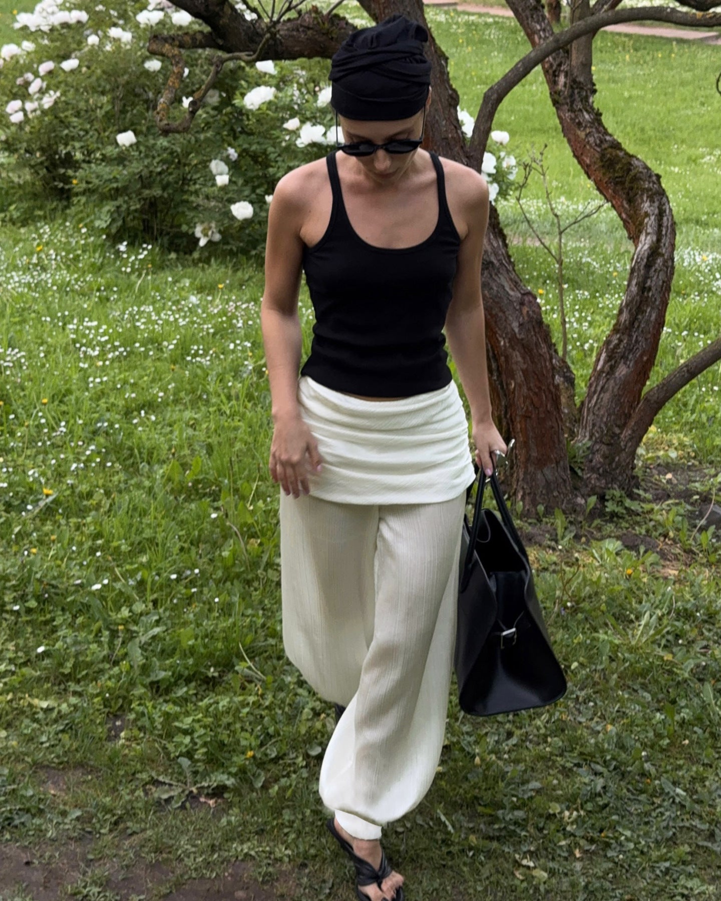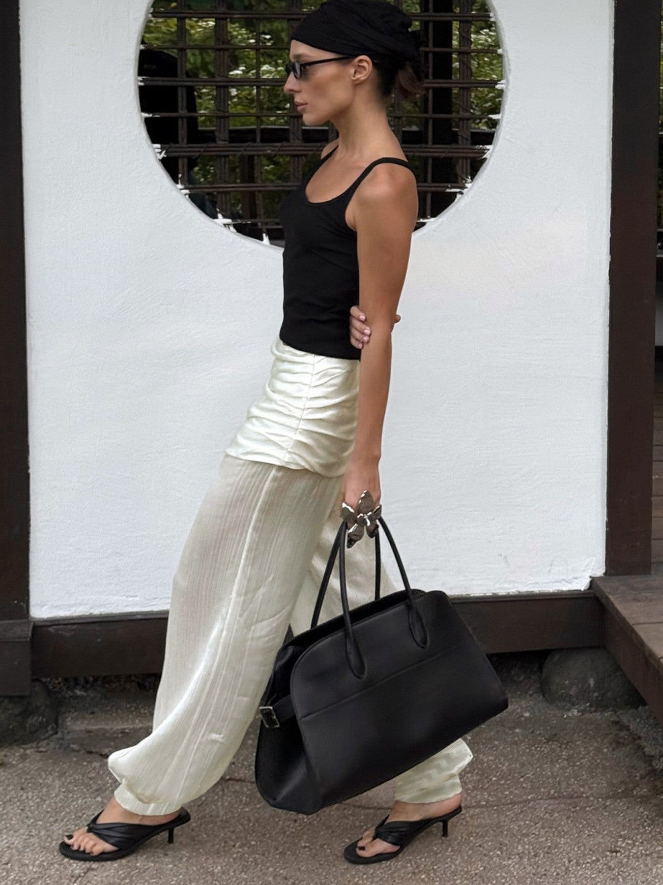 落ち感のあるシルエットでシアー素材の軽やかなデザインが、抜け感のあるアンニュイでモダンな印象に。