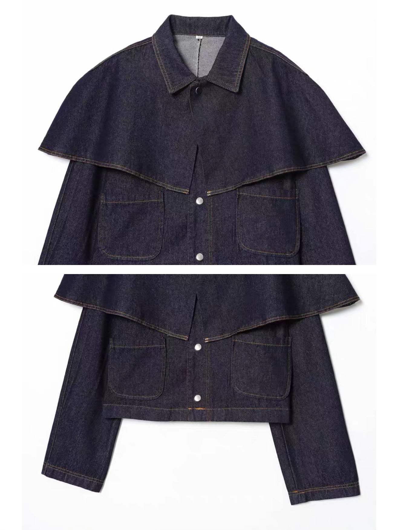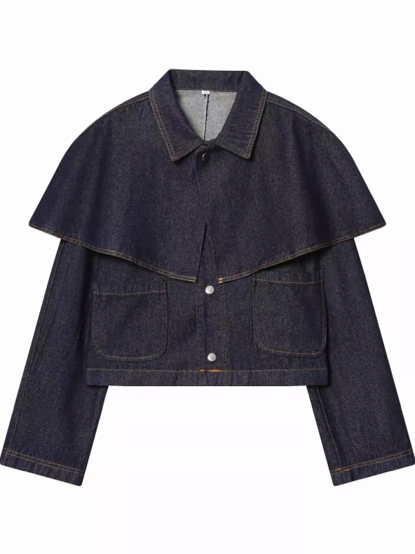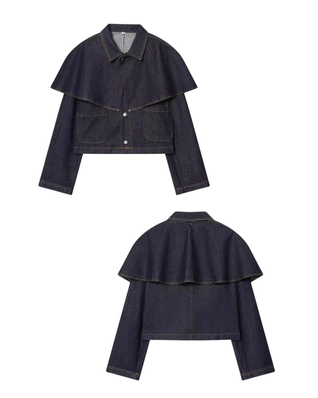 ノンウォッシュのデニムジャケットにショールデザインが施され、モダンなレディーライクな仕上がりに。