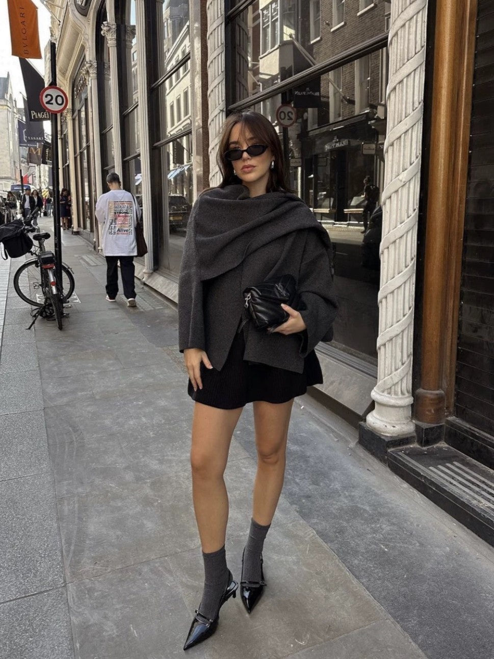 トレンドのケープ付きのデザインは、大人な印象に仕上げてくれるモダンシルエット。