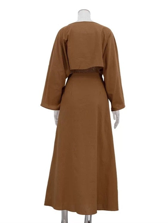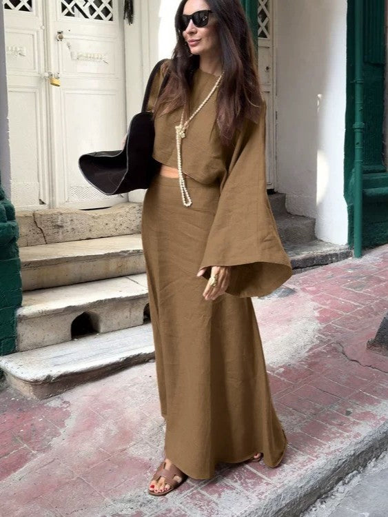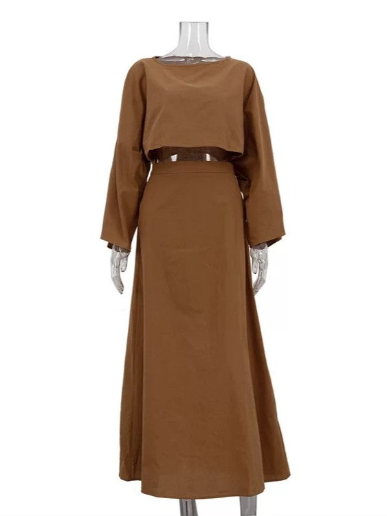 着用するだけスタイルアップが叶うワイドシルエットのクロップド丈トップスと、ハイウエストのフレアロングスカートのセットです。