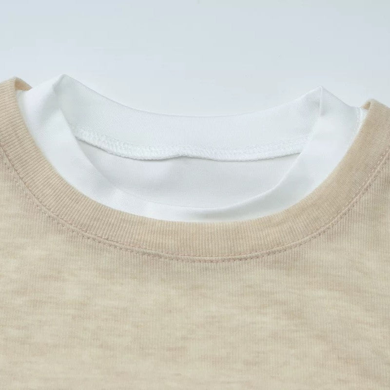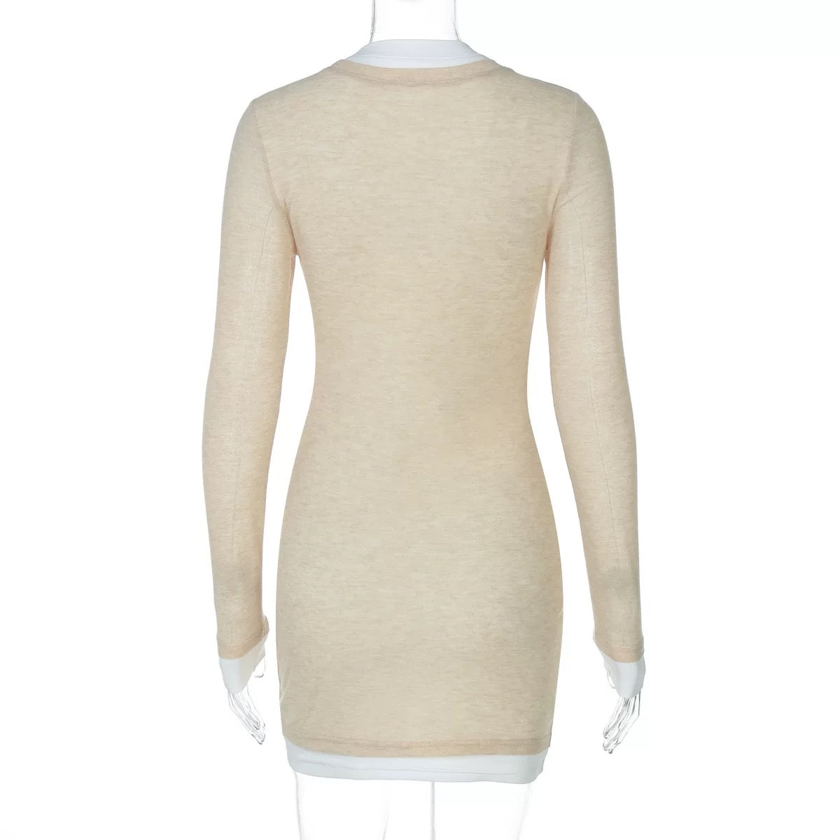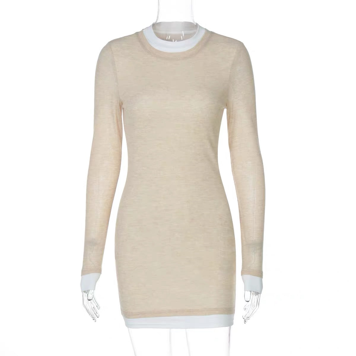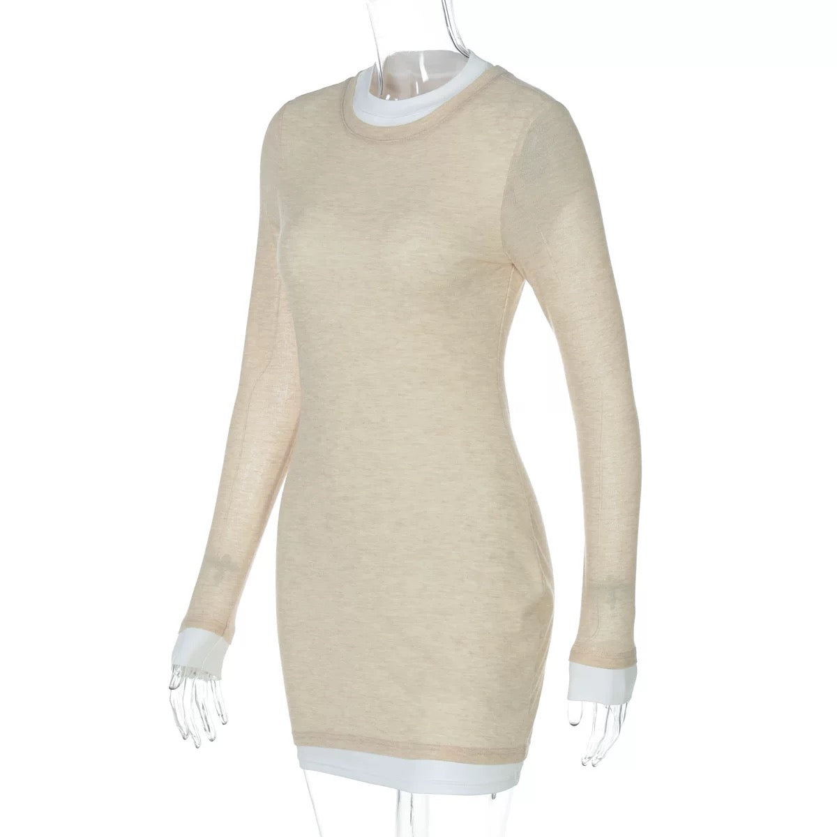 重ね着風のタイトなシルエットのミニ丈ワンピースは、カットソーライクなソフトな風合いで、着心地も◎