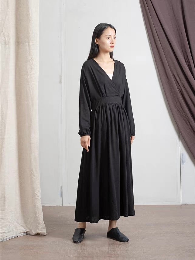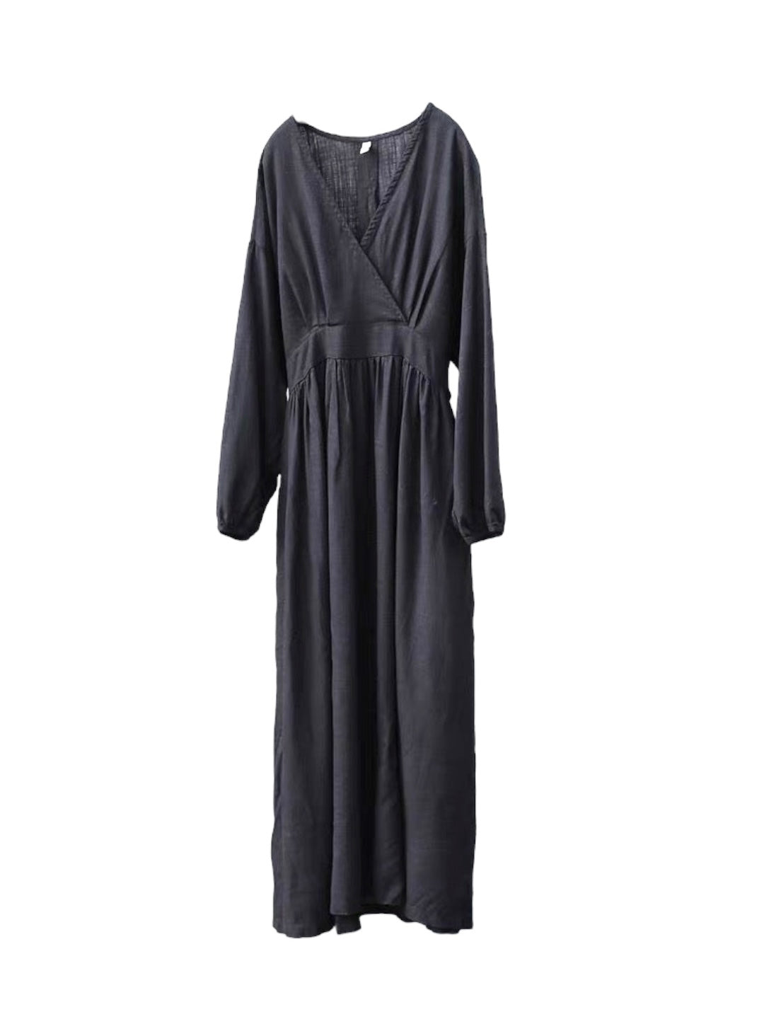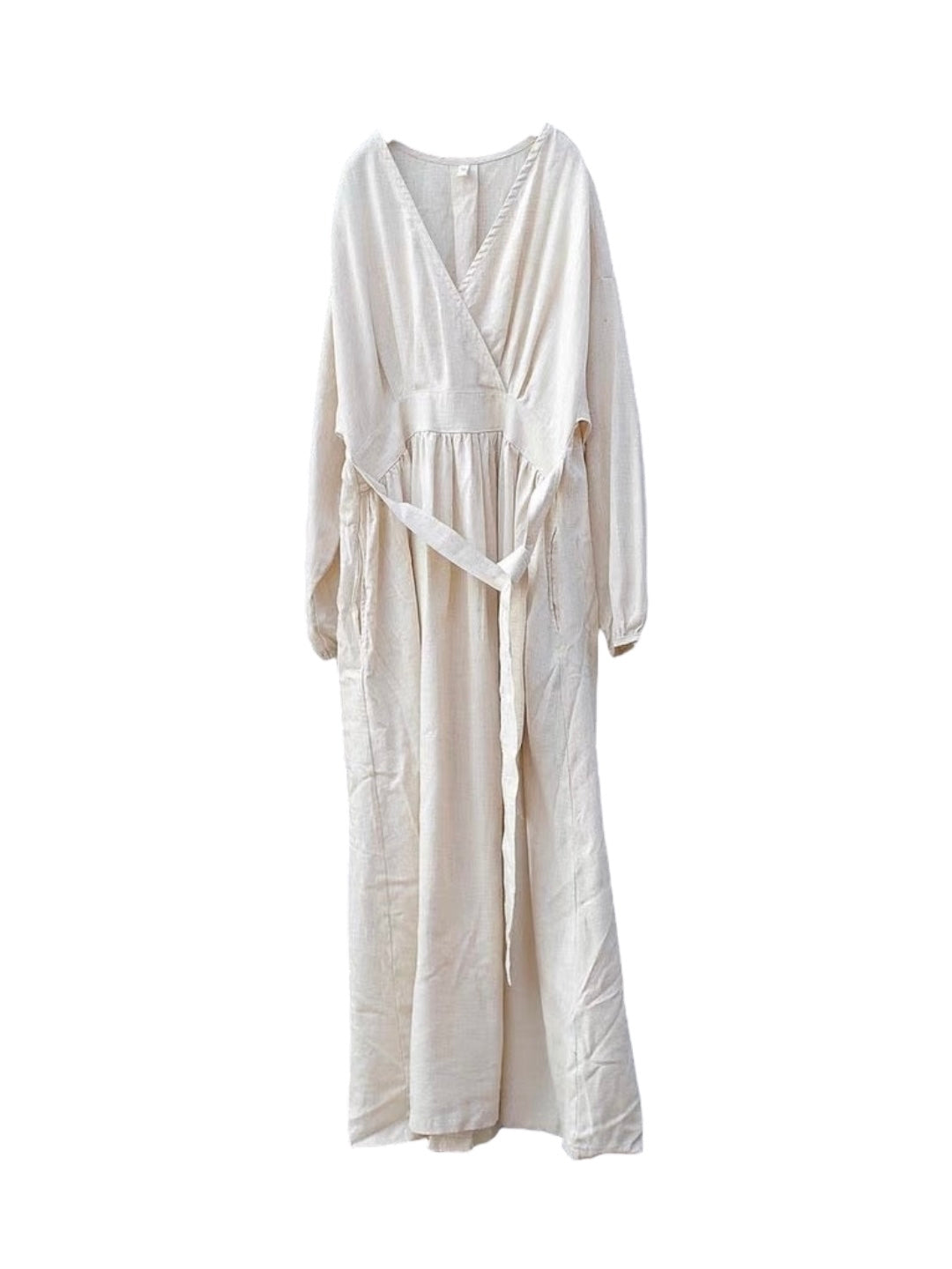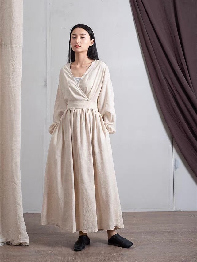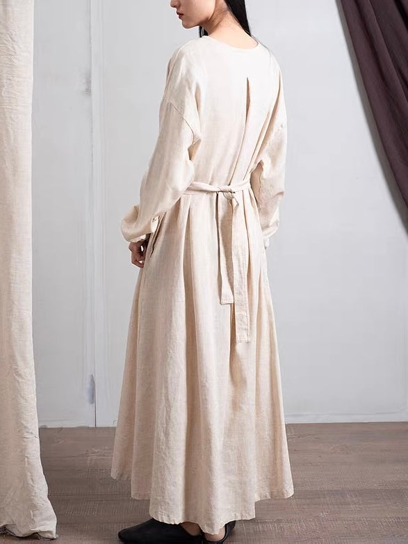 ナチュラルリネンフレア切り替えロングワンピースです。