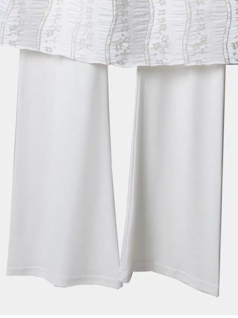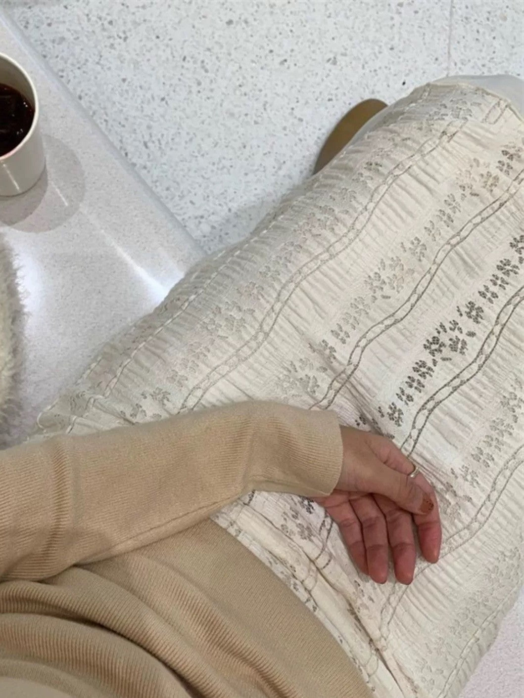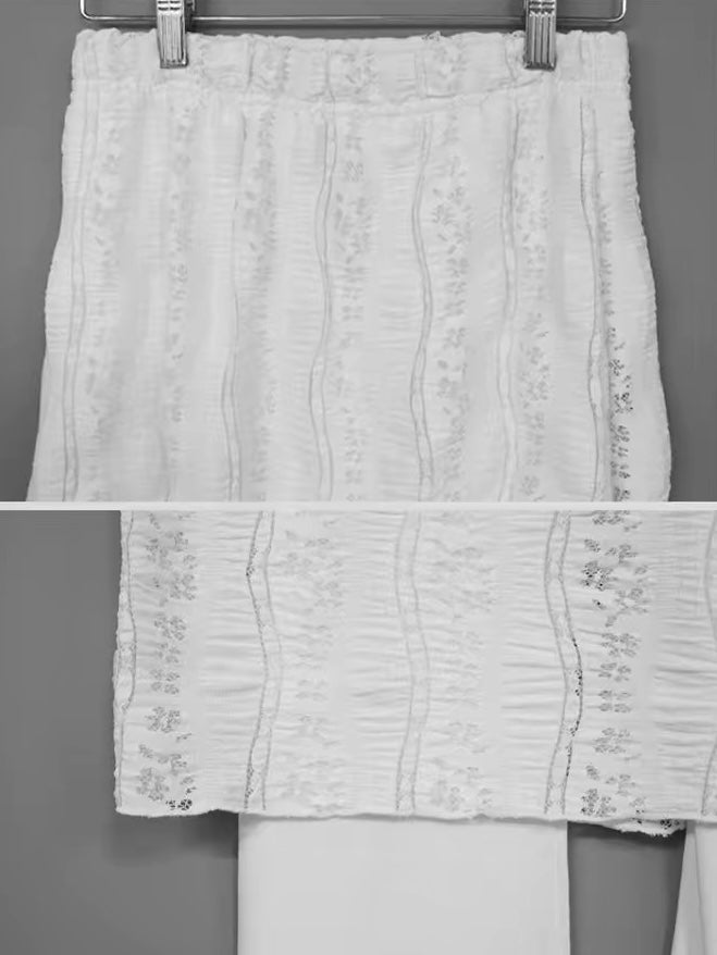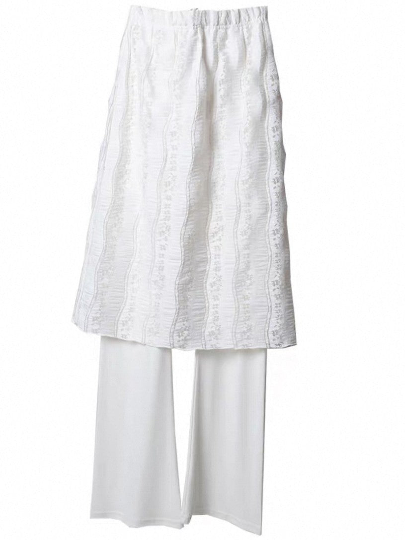 スカート部分は凹凸のある生地で、上品な立体感。裾はゆらっと揺れるラインでナチュラルな刺繍風の柄がやさしい印象。縦ラインが入っているから、脚がきれいに見える効果も◎