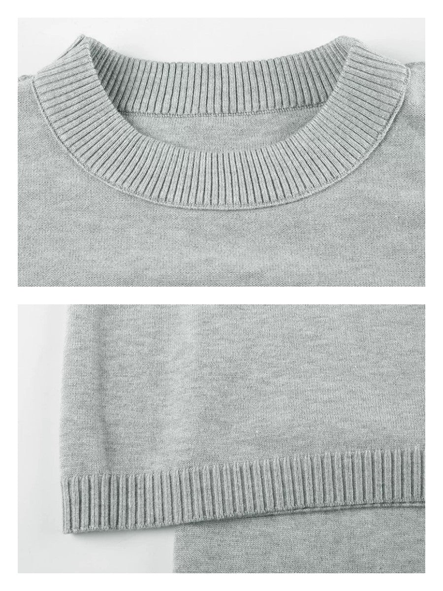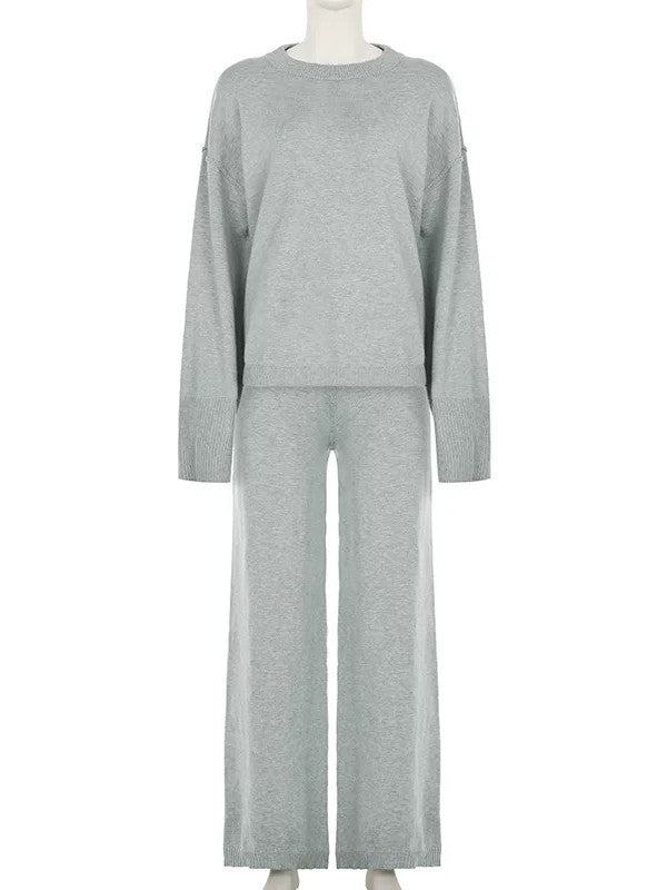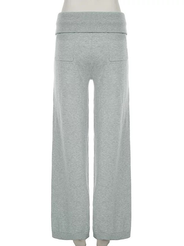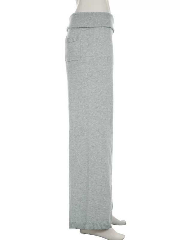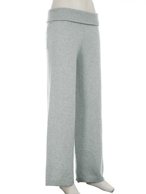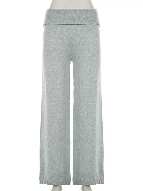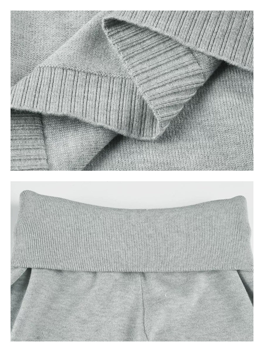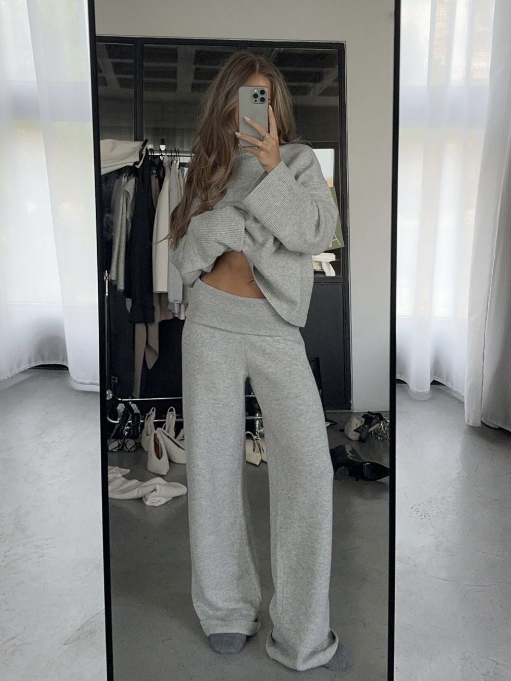 シンプルなクルーネックセーターは手首部分が長めのリブで全体のシルエットをきれいに見せてくれます。パンツはワイドなウエストバンドを折り返したデザイン。ストレートワイドレッグシルエットで脚長効果も◎