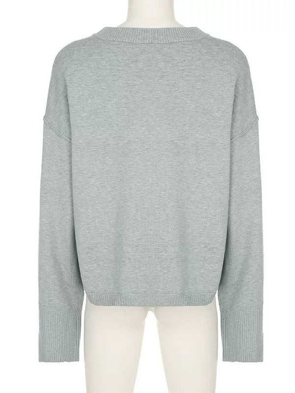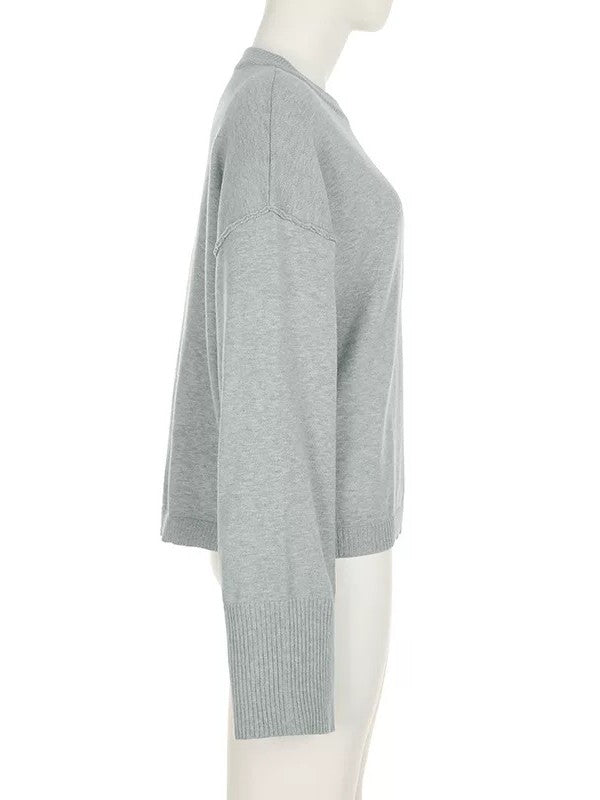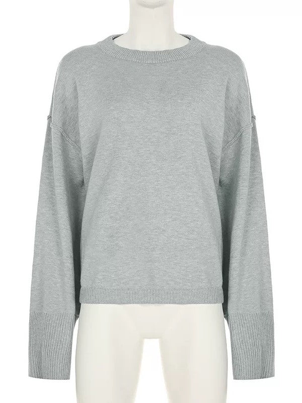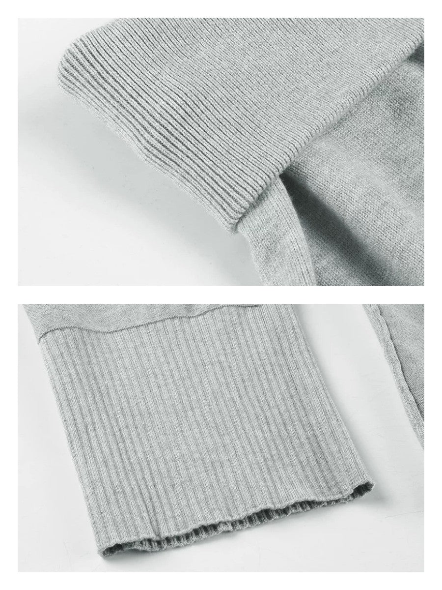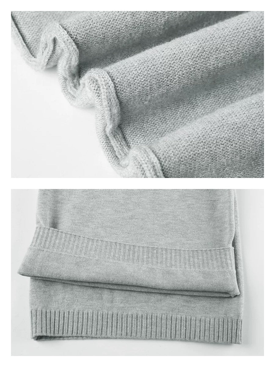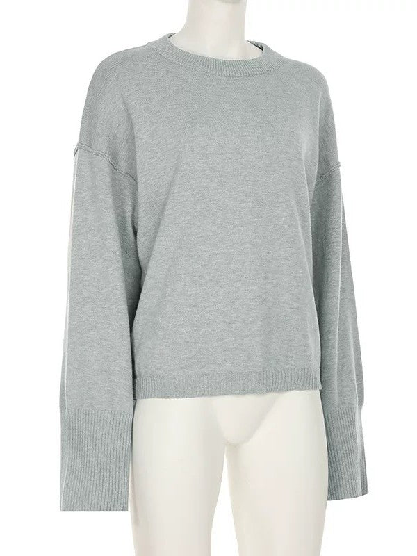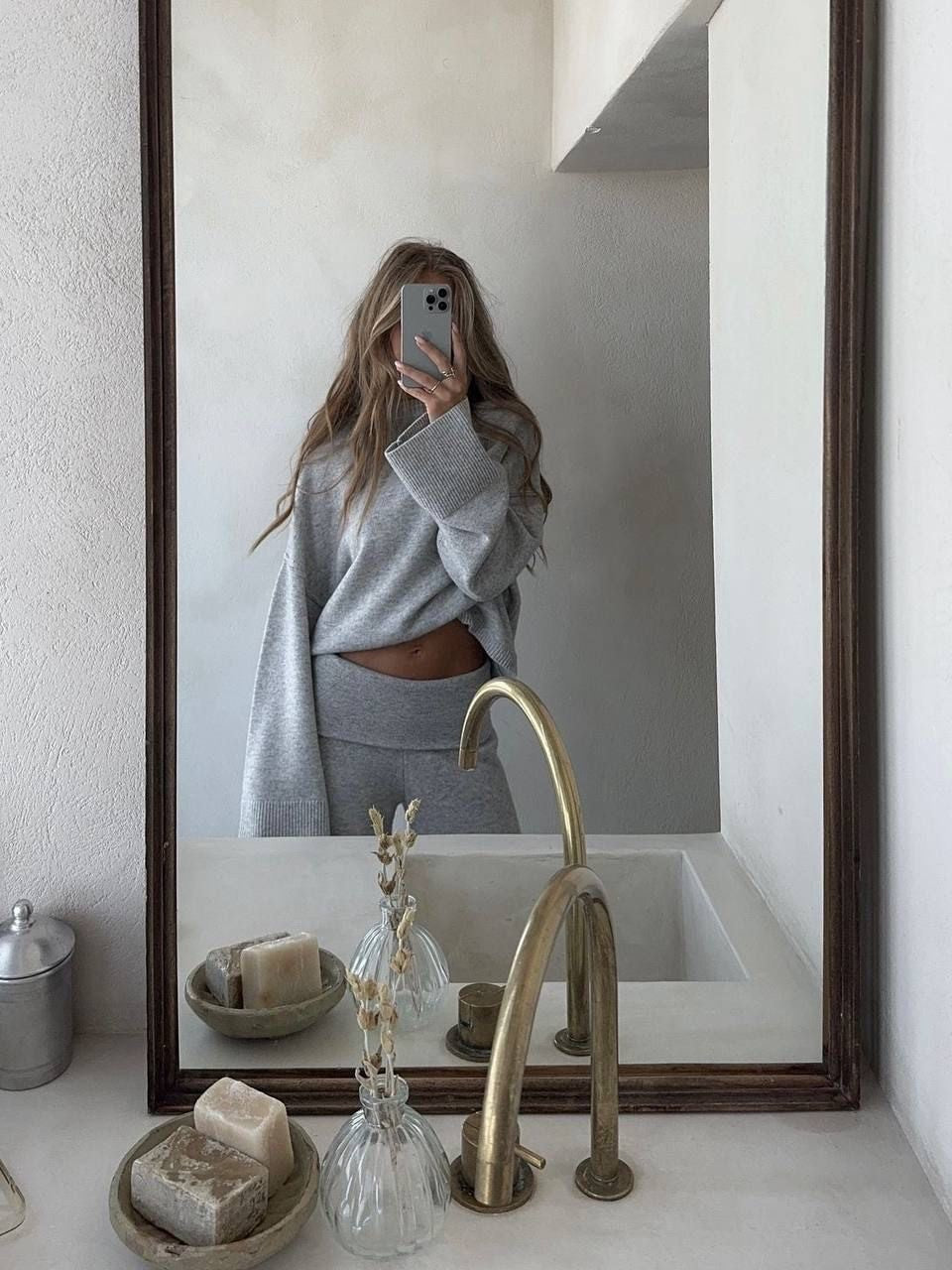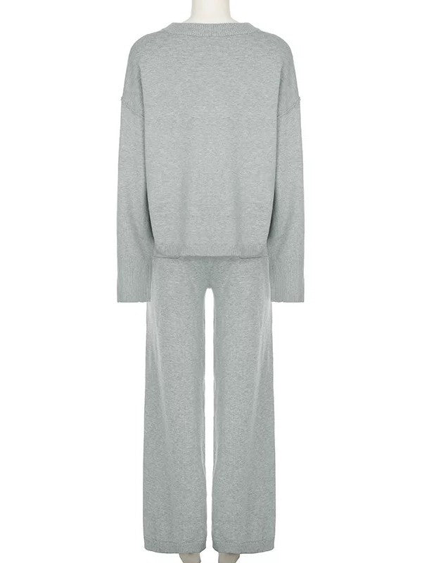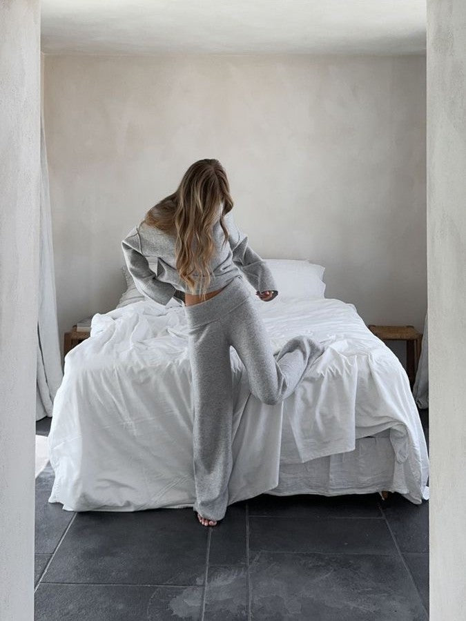 シンプルなクルーネックセーターは手首部分が長めのリブで全体のシルエットをきれいに見せてくれます。パンツはワイドなウエストバンドを折り返したデザイン。ストレートワイドレッグシルエットで脚長効果も◎