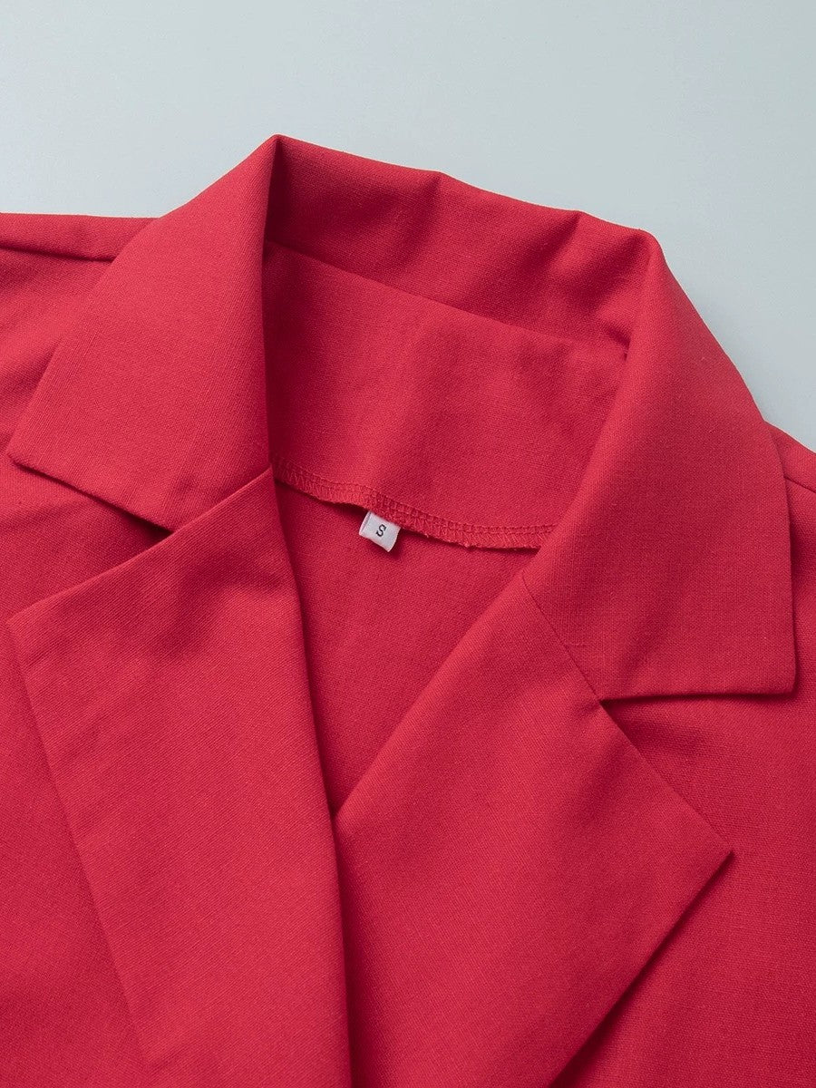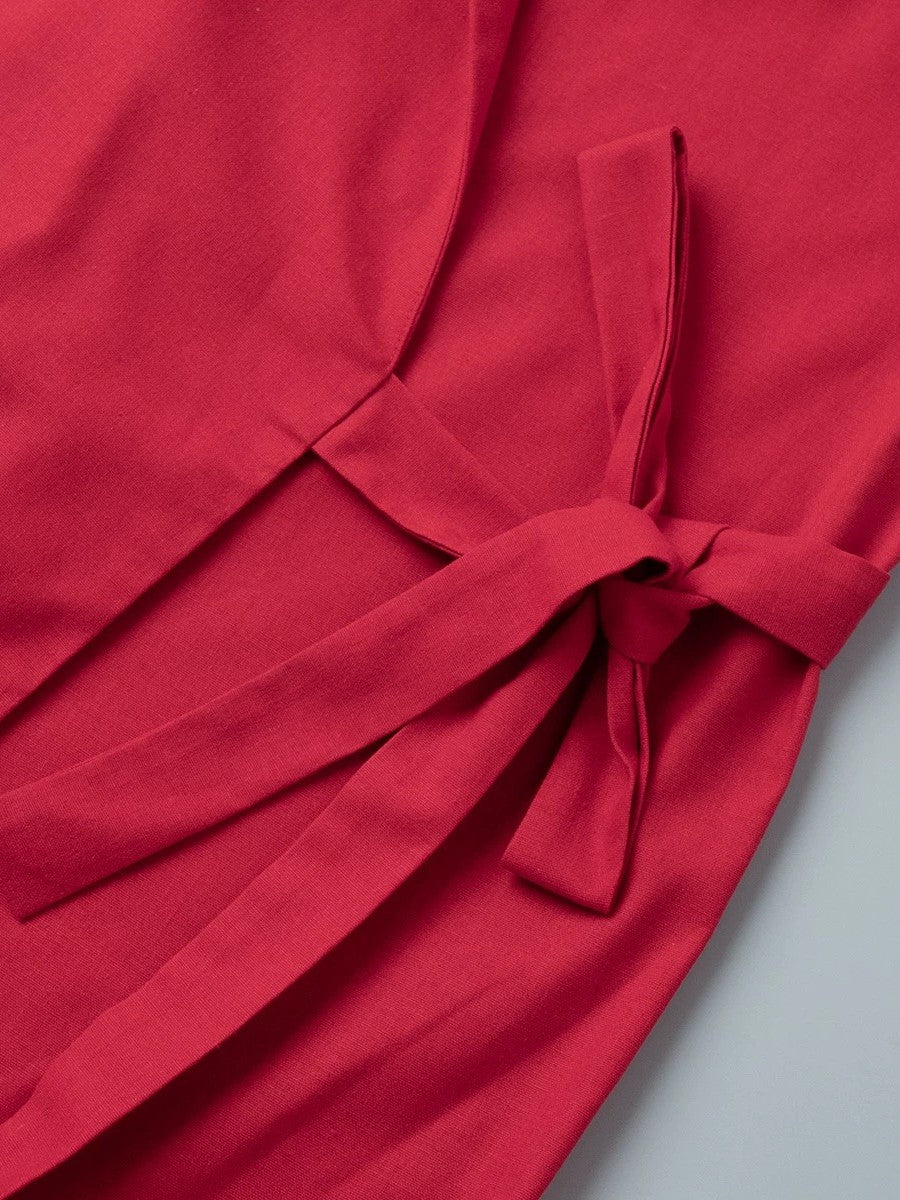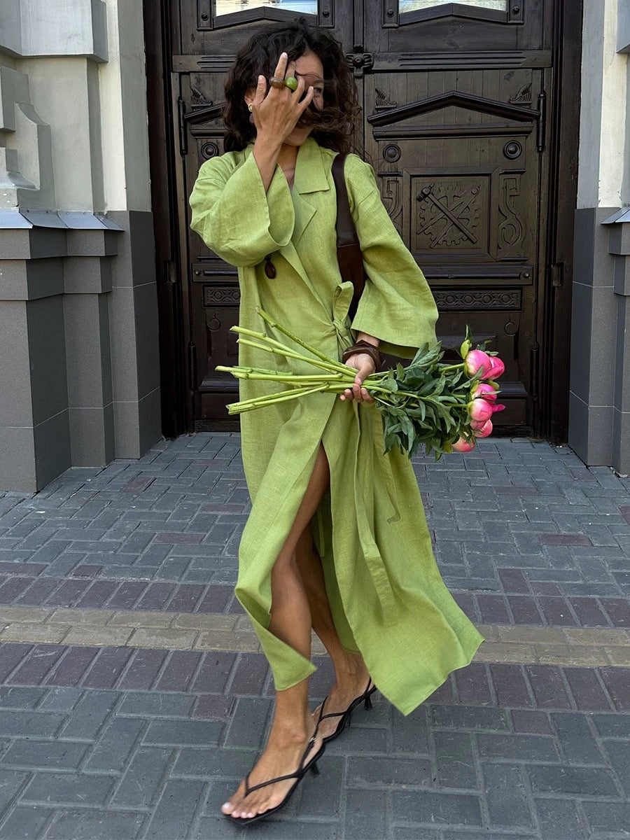 コットンリネンブレンドのナチュラルな風合いで、鮮やかなカラーが目を引くロング丈のラップタイプのジャケットです。