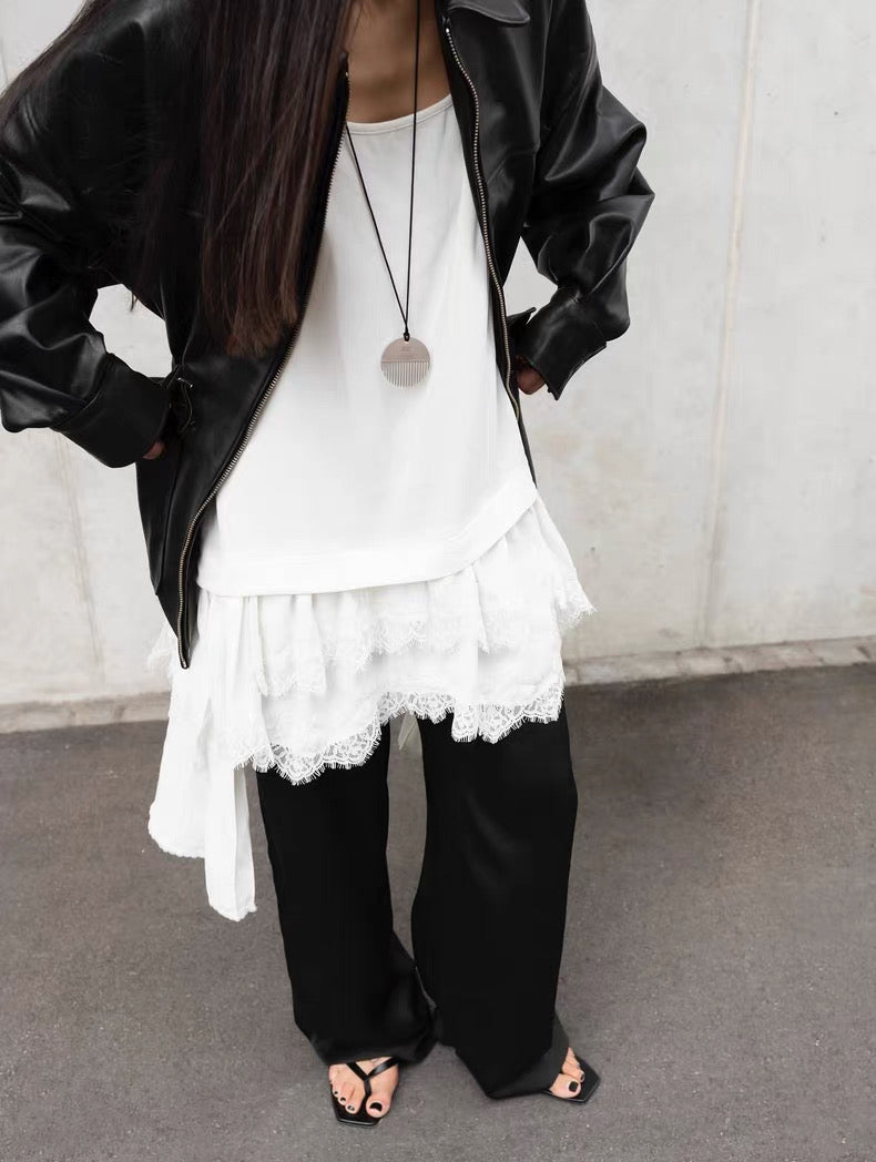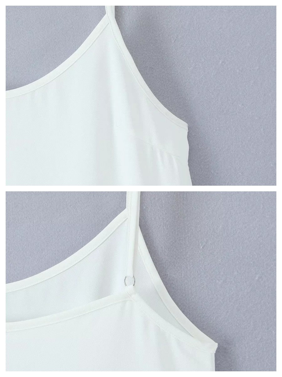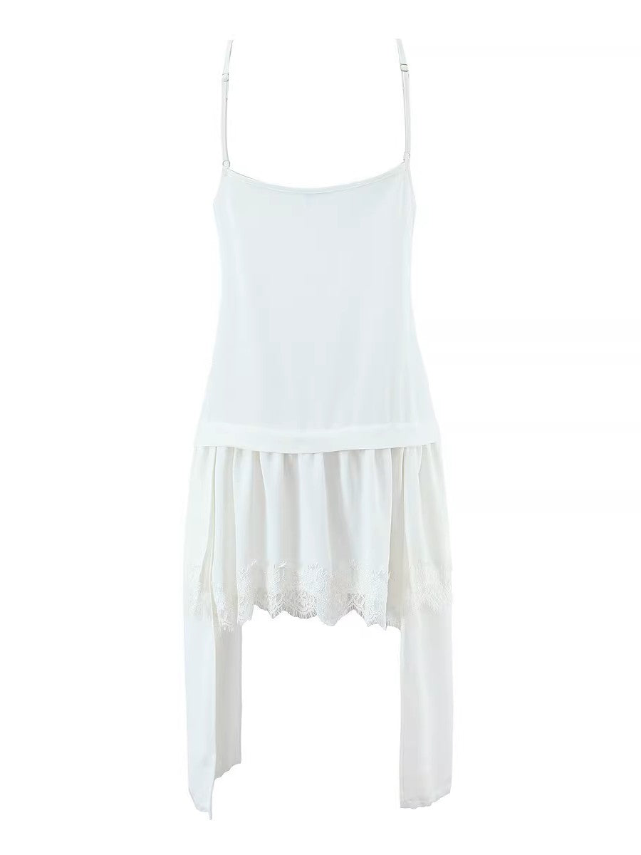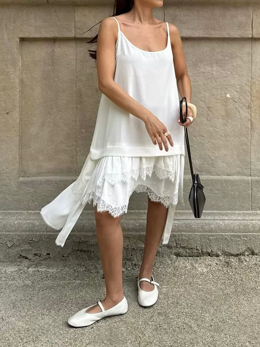 シンプルなキャミソール型のトップ部分から、裾に向かって繊細なレースが覗くデザインが、さりげなくフェミニンな印象をプラスします。