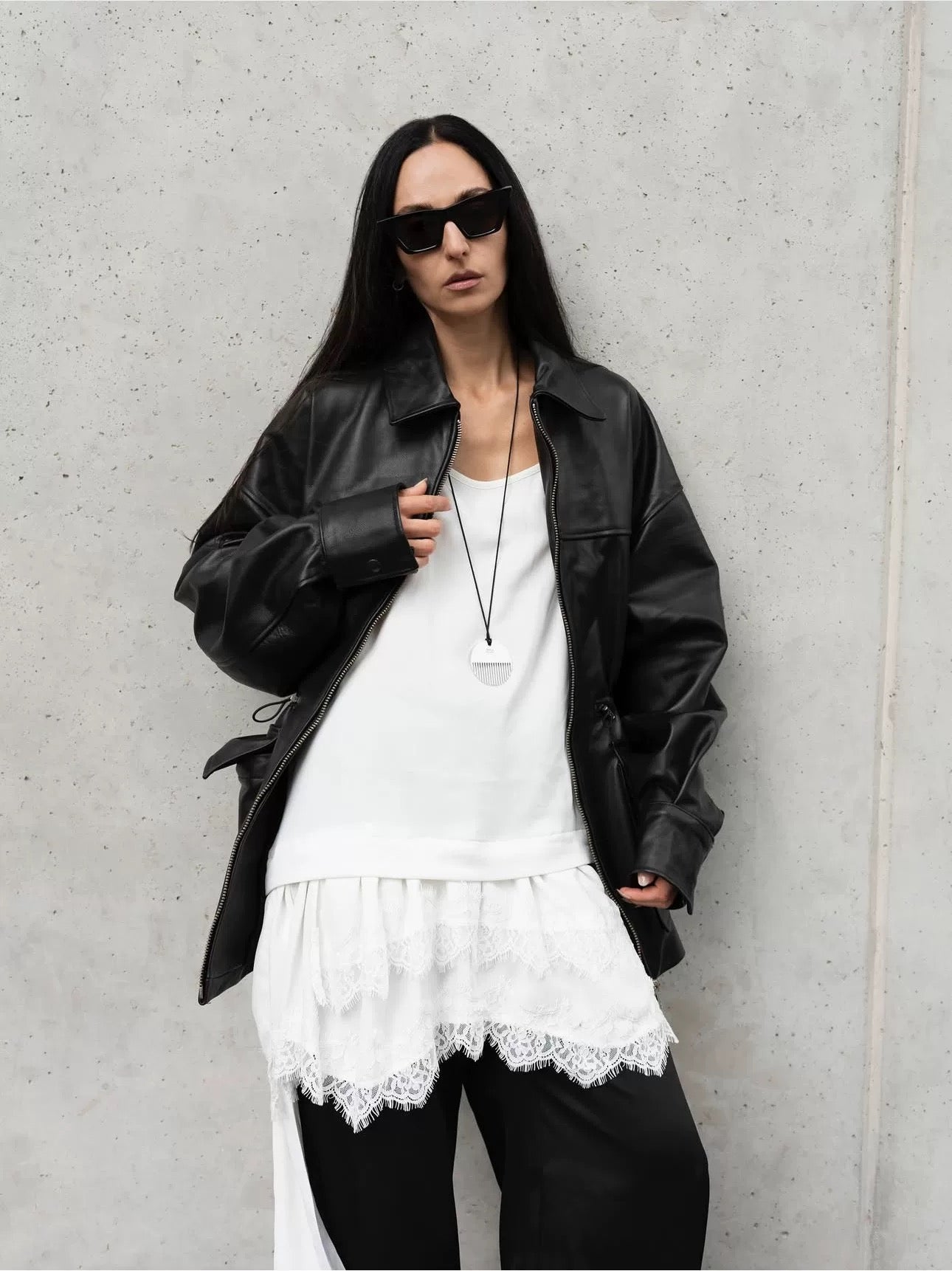 アシンメトリーに揺れるサイドのロングパネルが動きに表情を与え、歩くたびに軽やかなシルエットを演出。