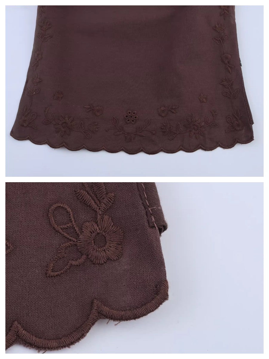 フロントにはクラシカルなフラワー刺繍を施し、さりげない立体感と女性らしい柔らかさをプラス。裾のスカラップデザインが軽やかな抜け感を演出し、スタイリングに奥行きを与えます。