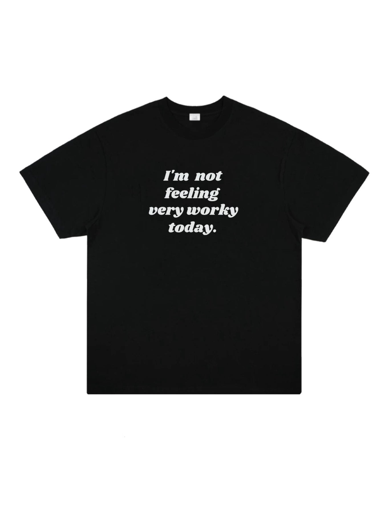 シンプルながらも、胸元にプリントされた"I‘m not feeling very worky today" (今日はあんまり仕事する気分じゃないの)との言葉がユーモラスな1枚!