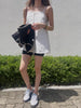 胸元にはさりげないボタンディテールをあしらい、ミニマルな中にアクセントをプラス。さらにネックラインには、ほんのり透け感のあるチュールライクなシアー素材の生地を重ね、さりげない抜け感と女性らしい繊細さをプラスしています。