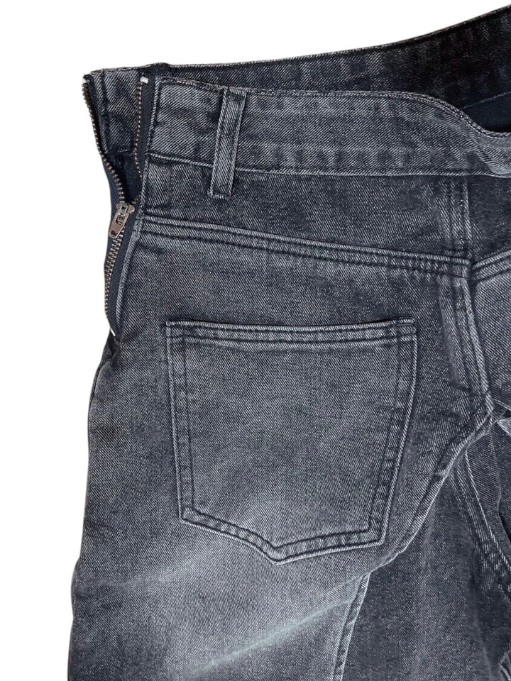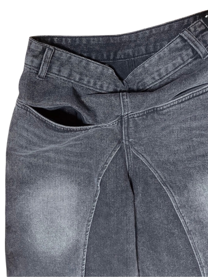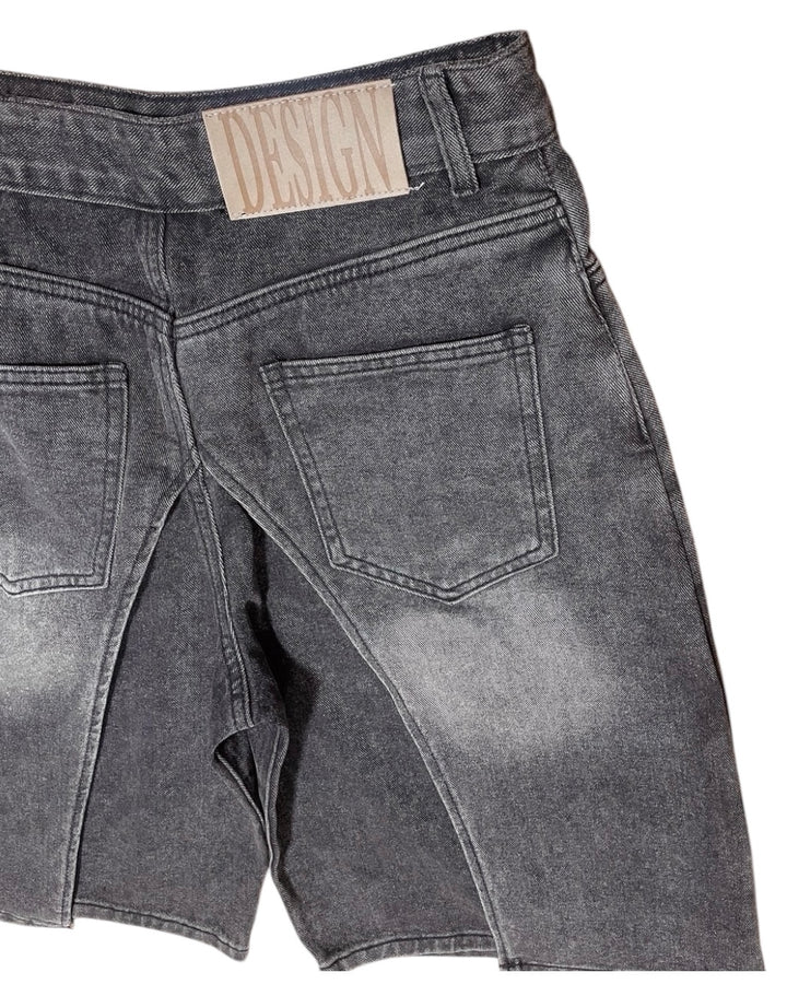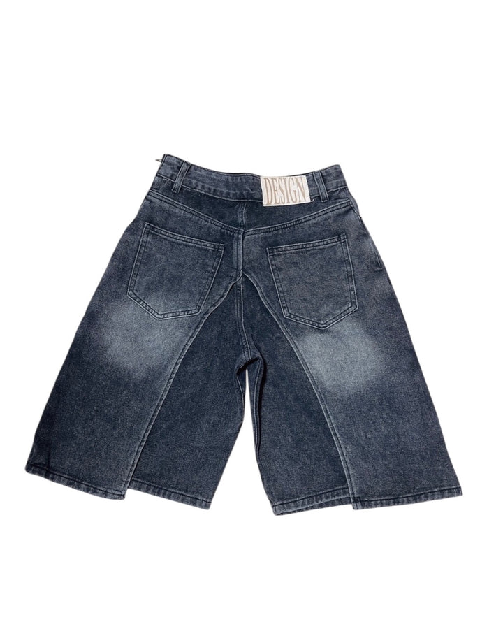 レイヤード風のデニムショートパンツは、サイドから見るとスカートを履いているようなデザインになっています。
