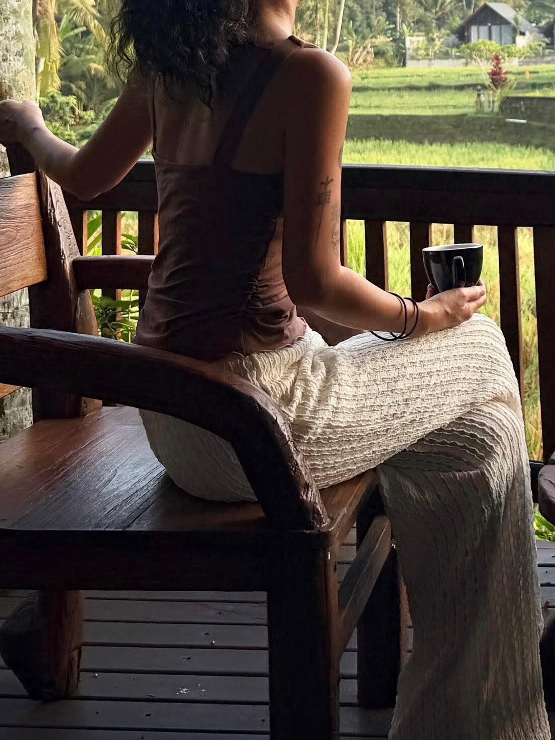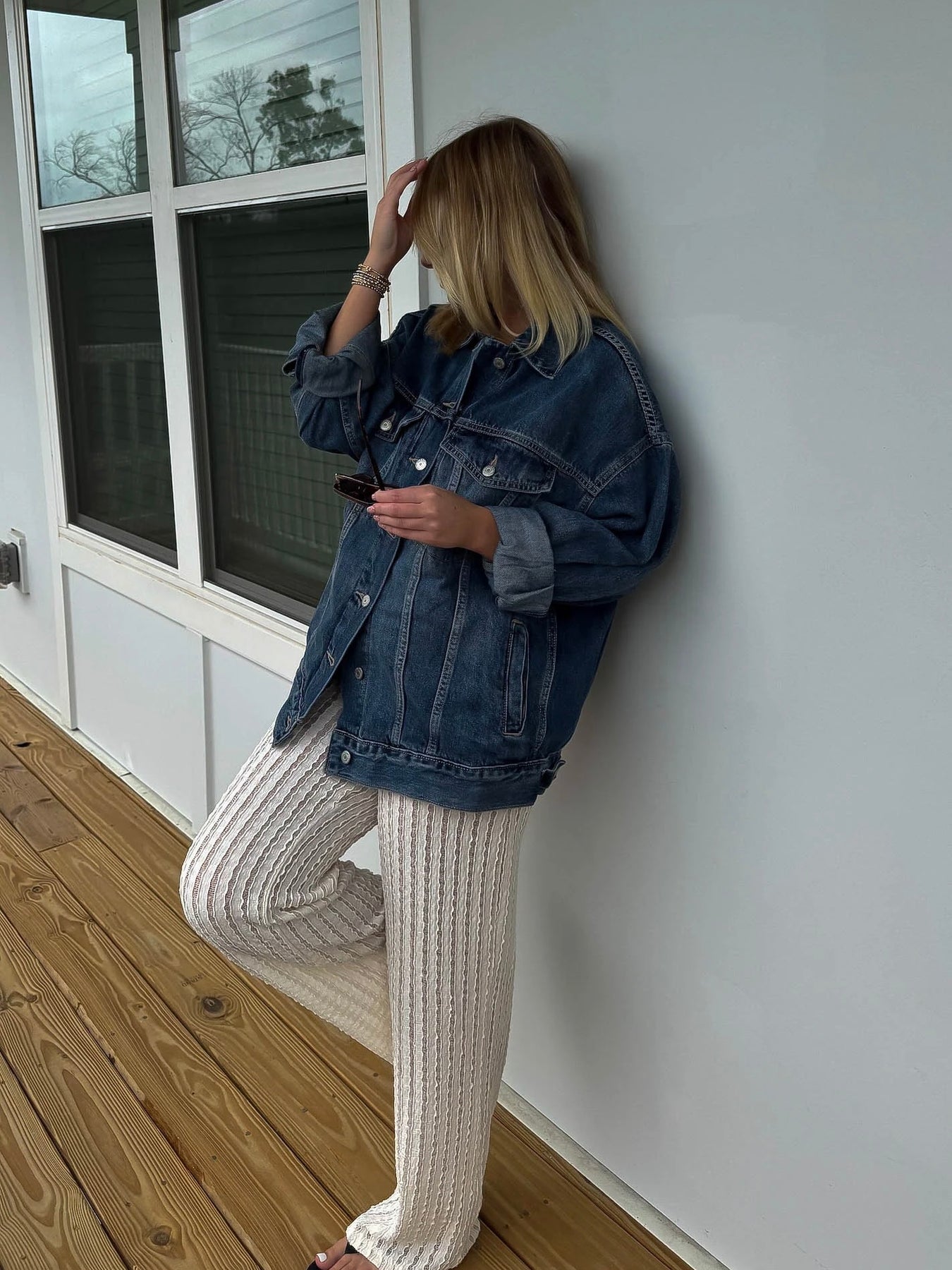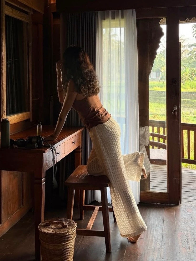 シアー感のあるナチュラルな抜け感を演出するパンツは、ウエストゴム仕様で伸縮性もあるので、イージー・ノンストレスな履き心地◎