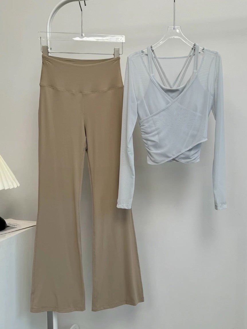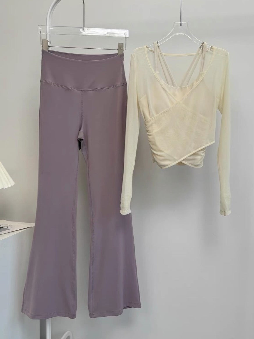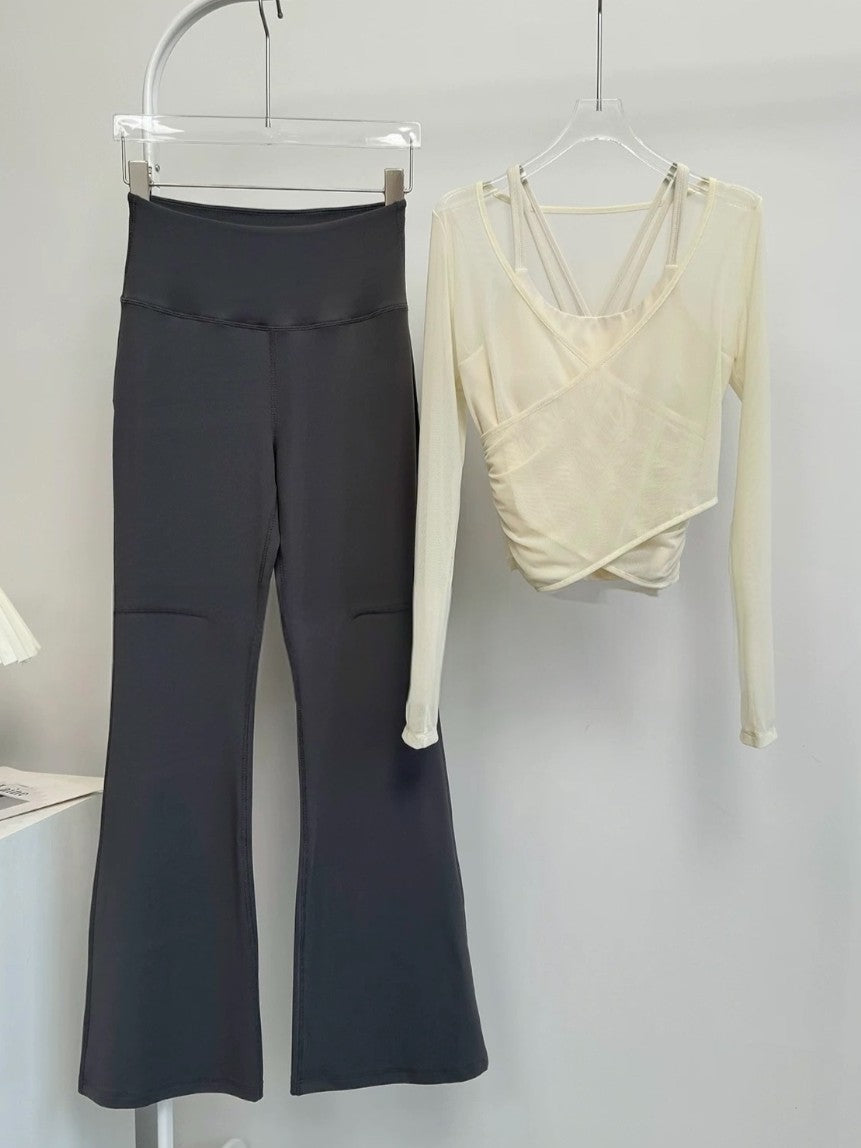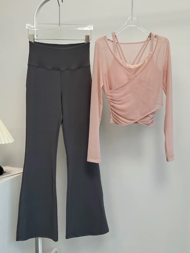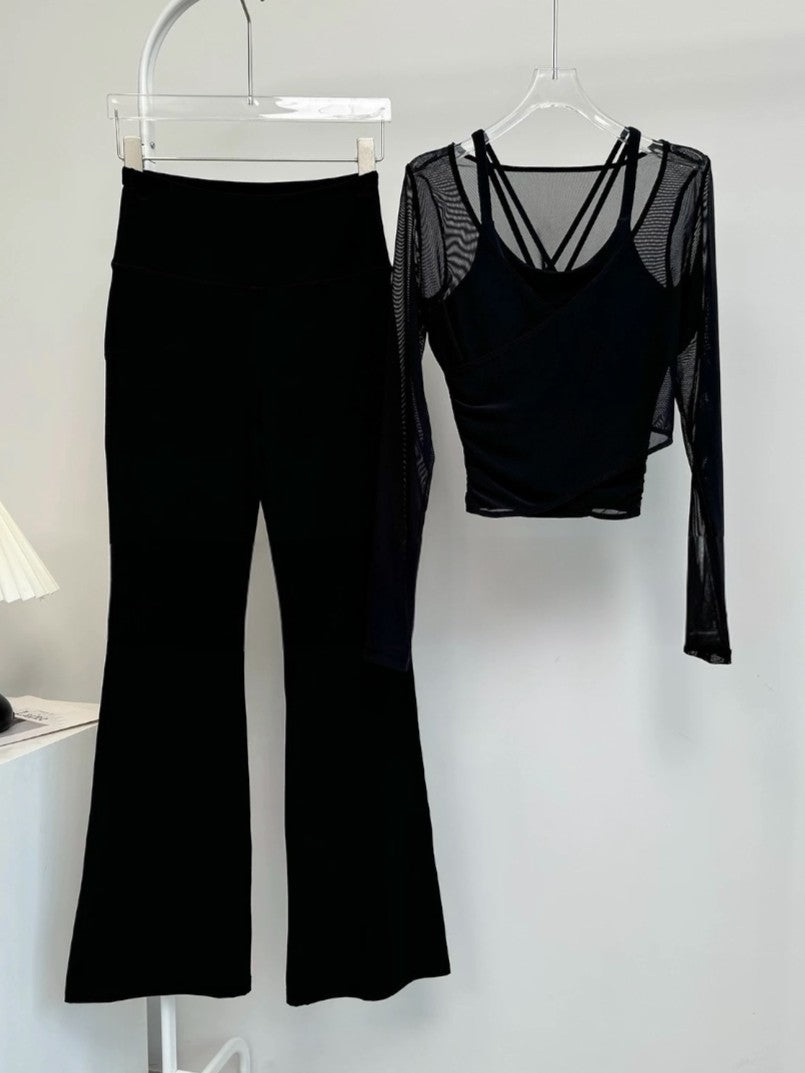 カップ付きブラトップがレイヤードデザインされたシアーメッシュで透け感のあるロングスリーブトップスと、スタイルアップ力抜群のフレアレギンスのセットです。