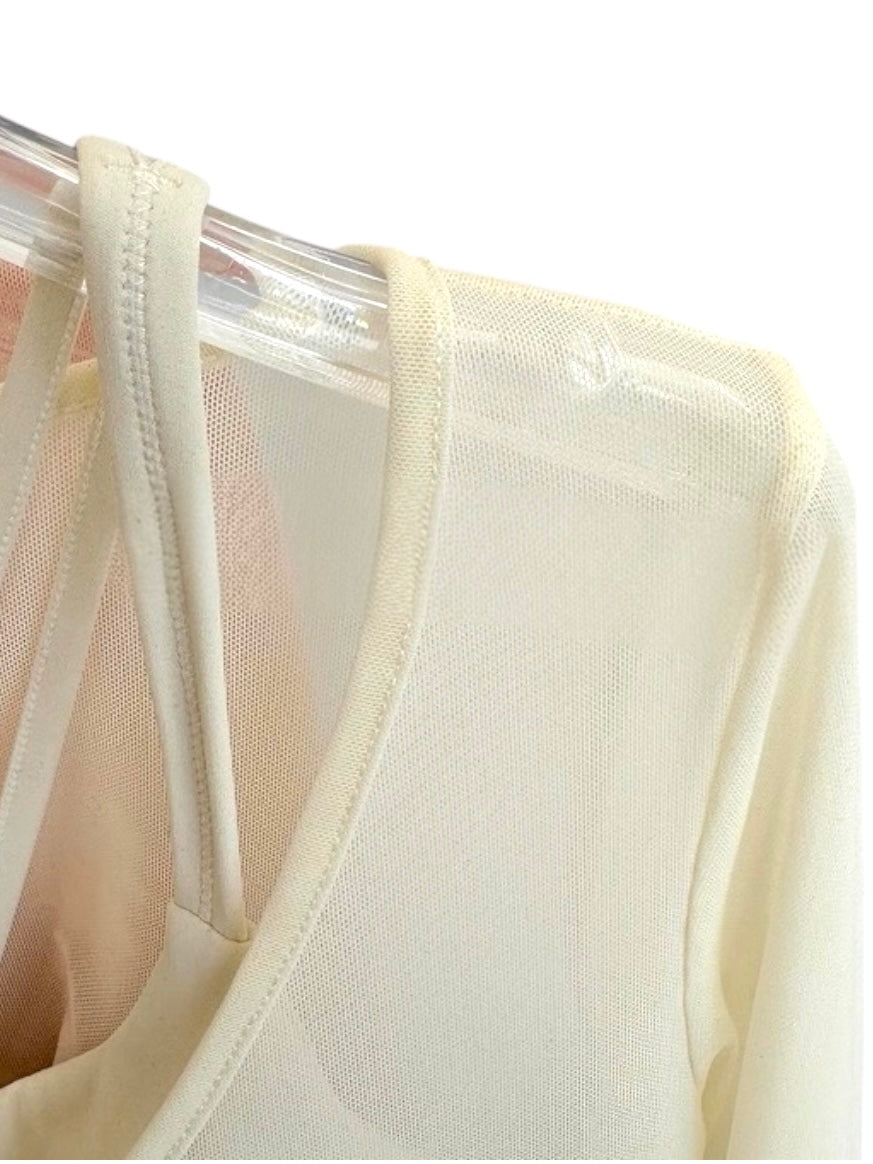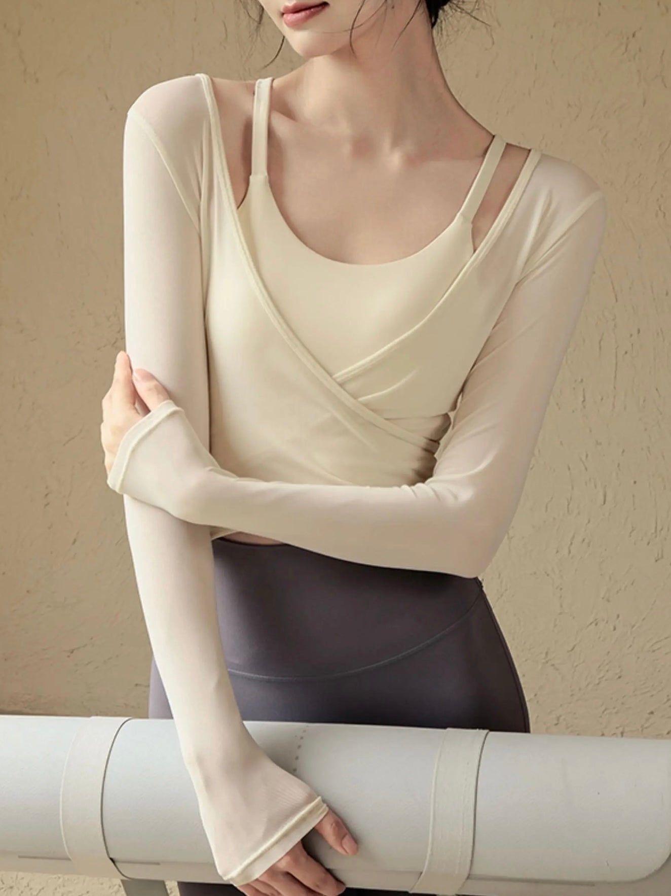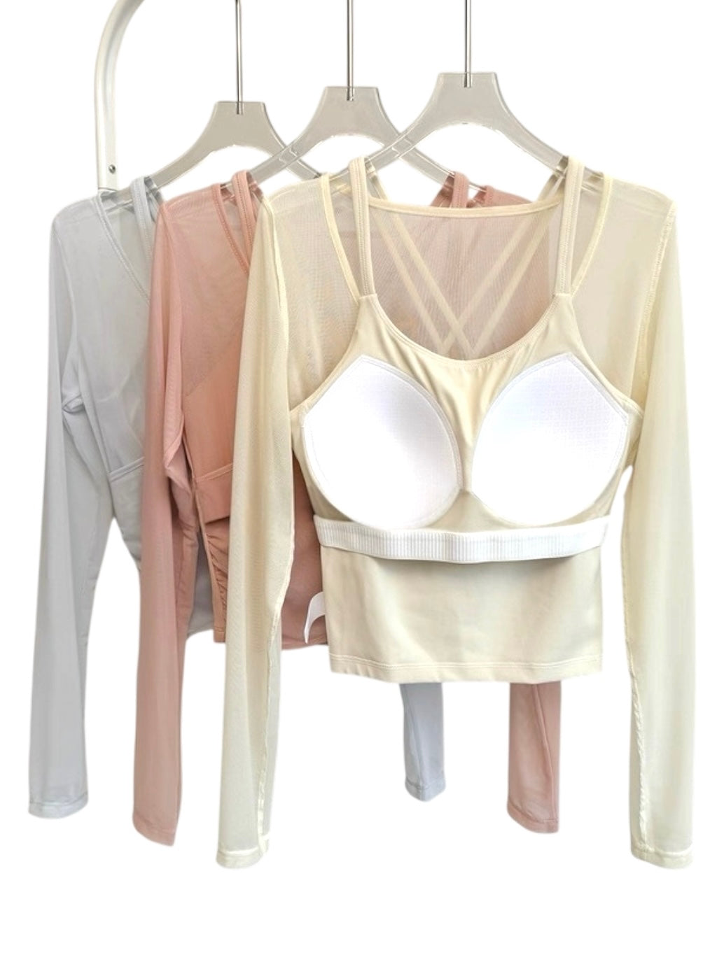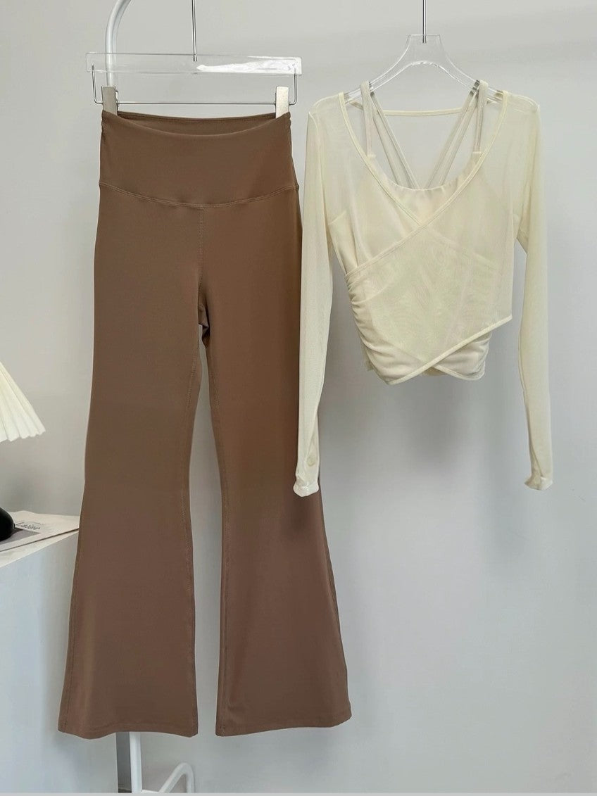 カップ付きブラトップがレイヤードデザインされたシアーメッシュで透け感のあるロングスリーブトップスと、スタイルアップ力抜群のフレアレギンスのセットです。