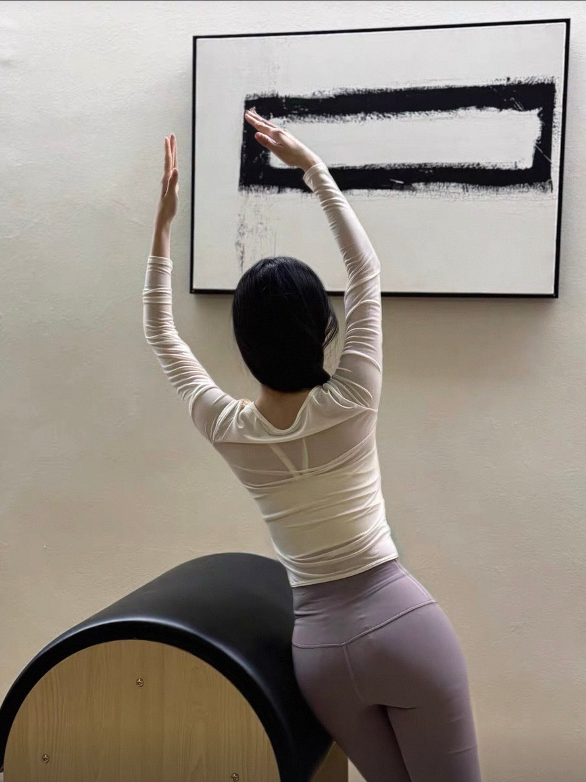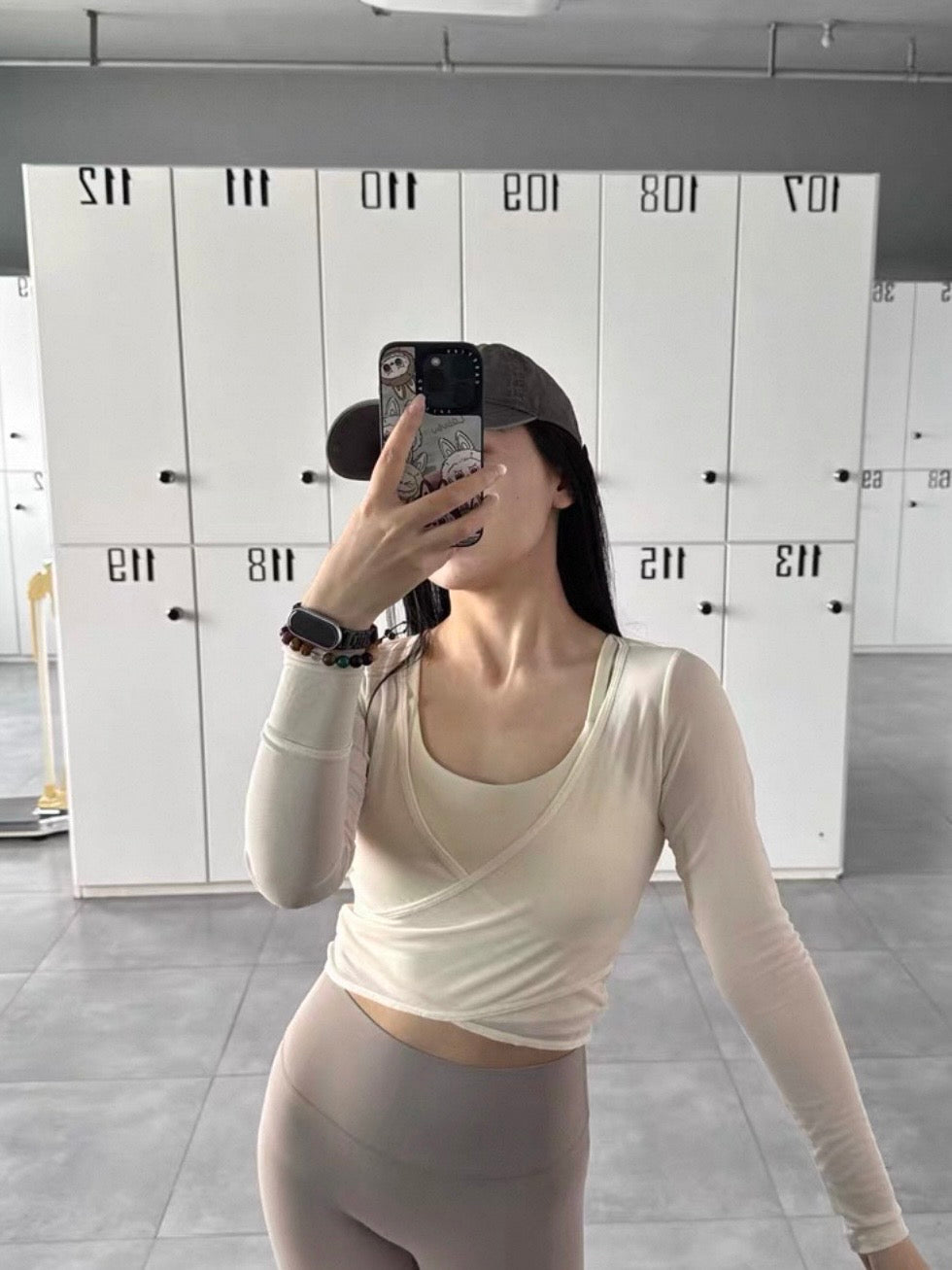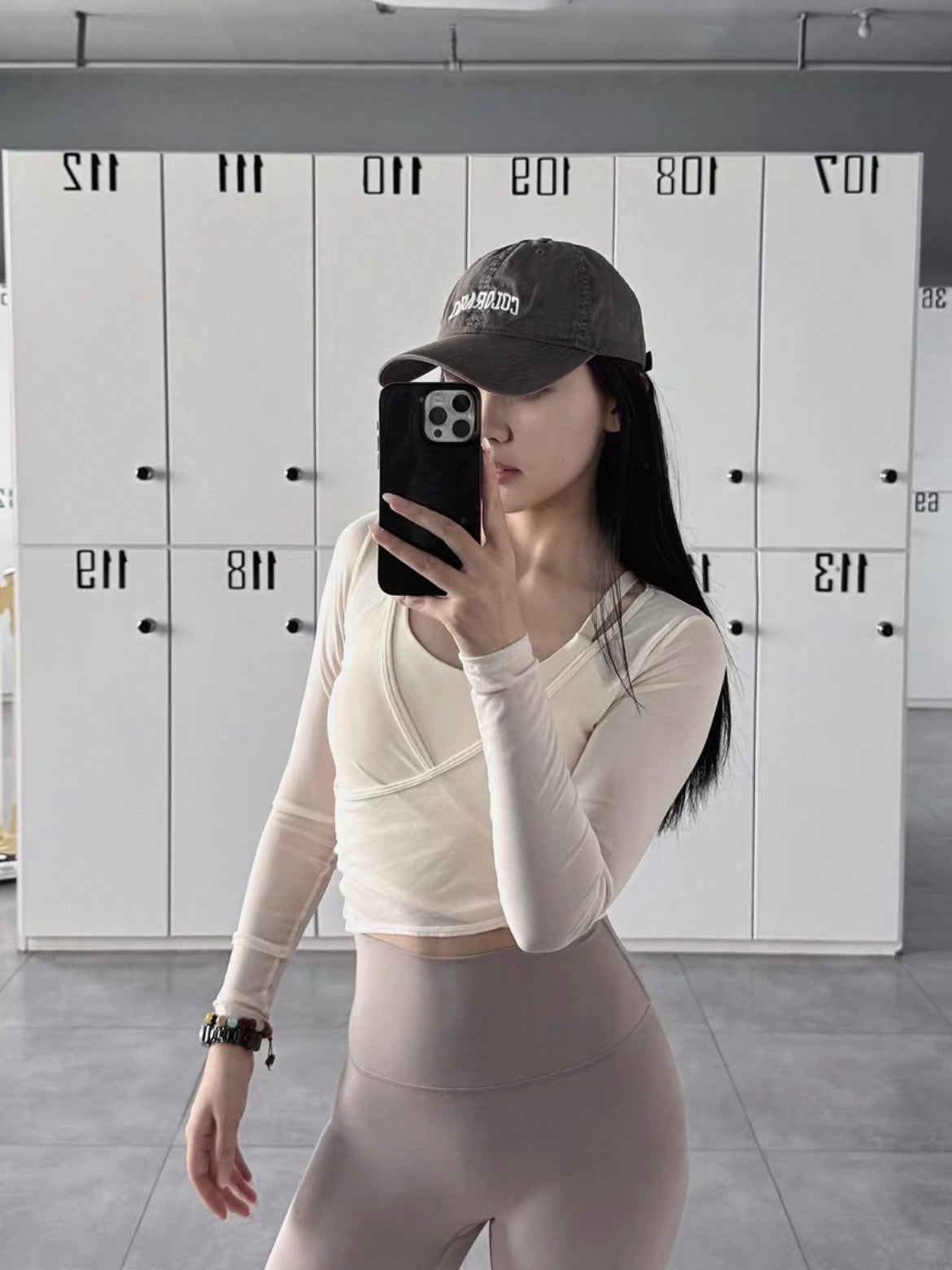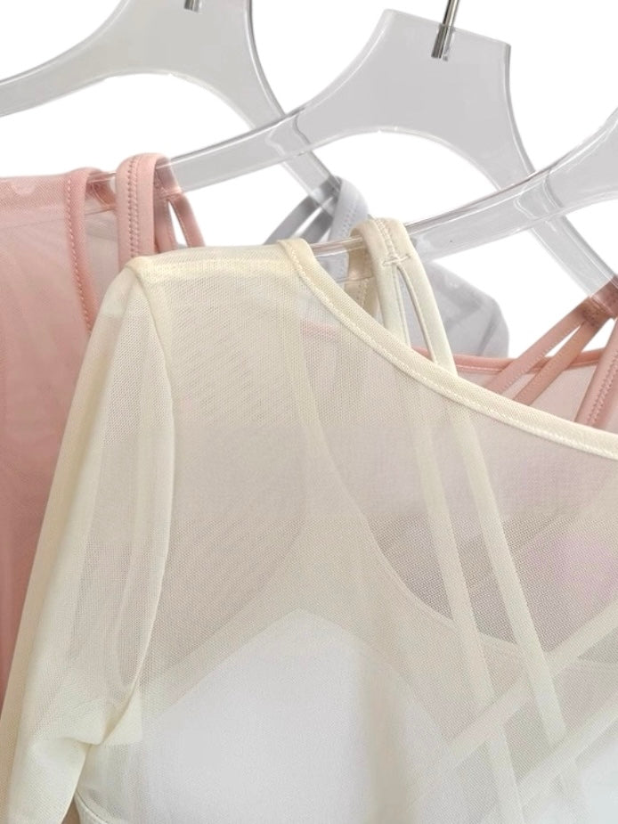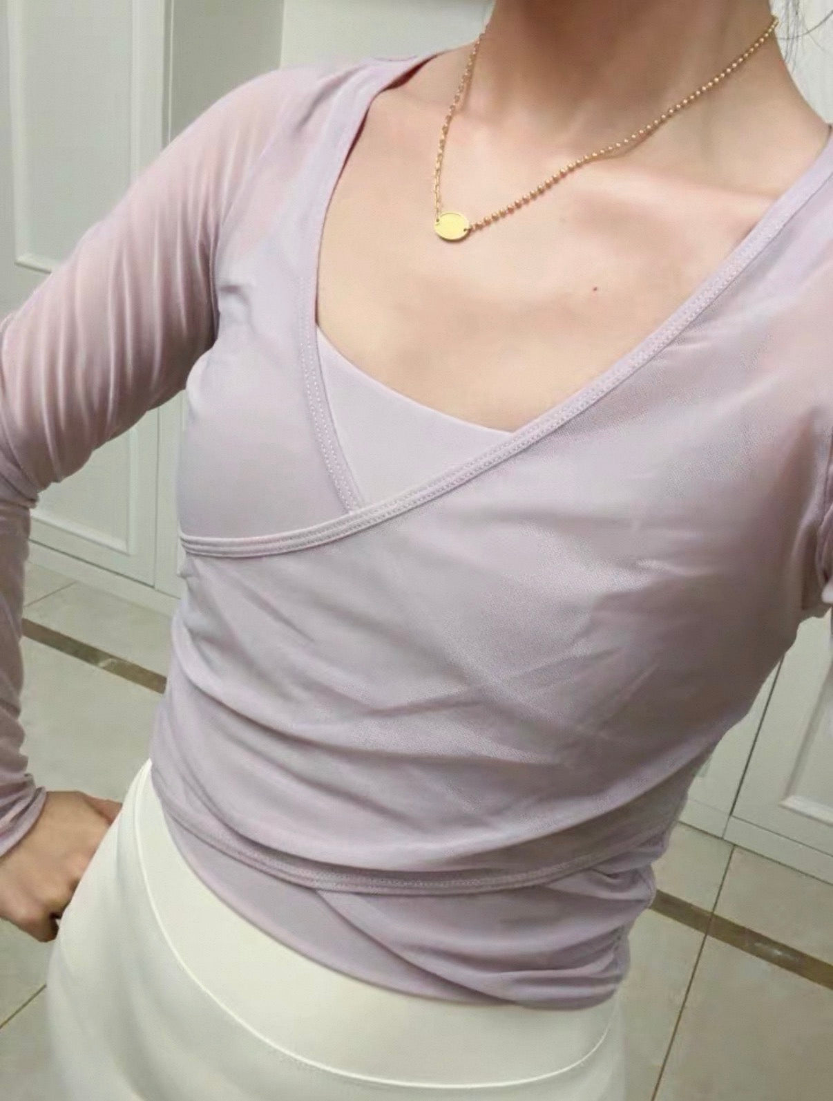 カップ付きブラトップがレイヤードデザインされたシアーメッシュで透け感のあるロングスリーブトップスと、スタイルアップ力抜群のフレアレギンスのセットです。