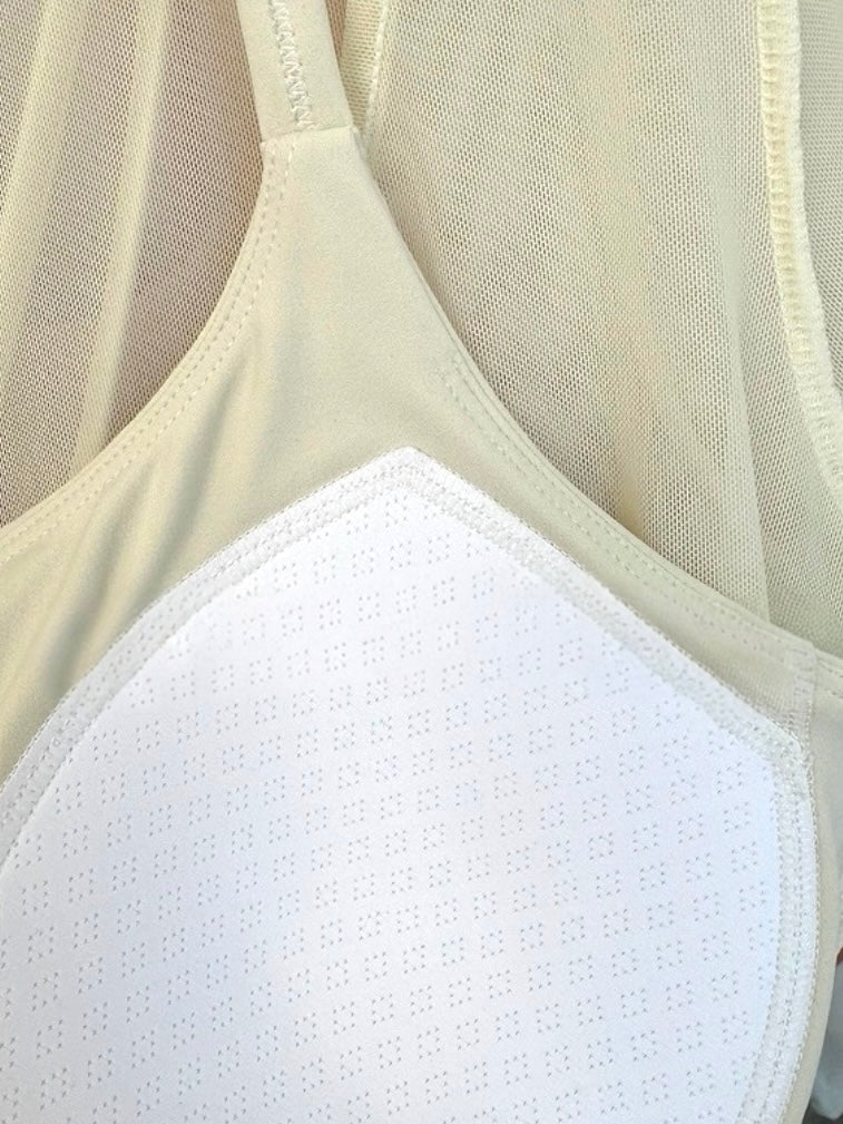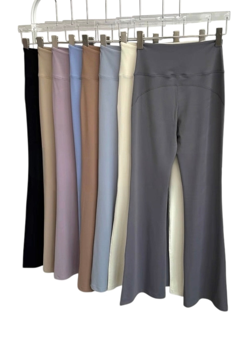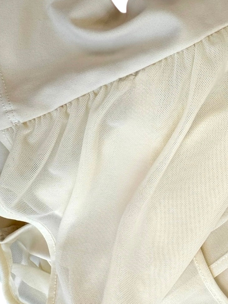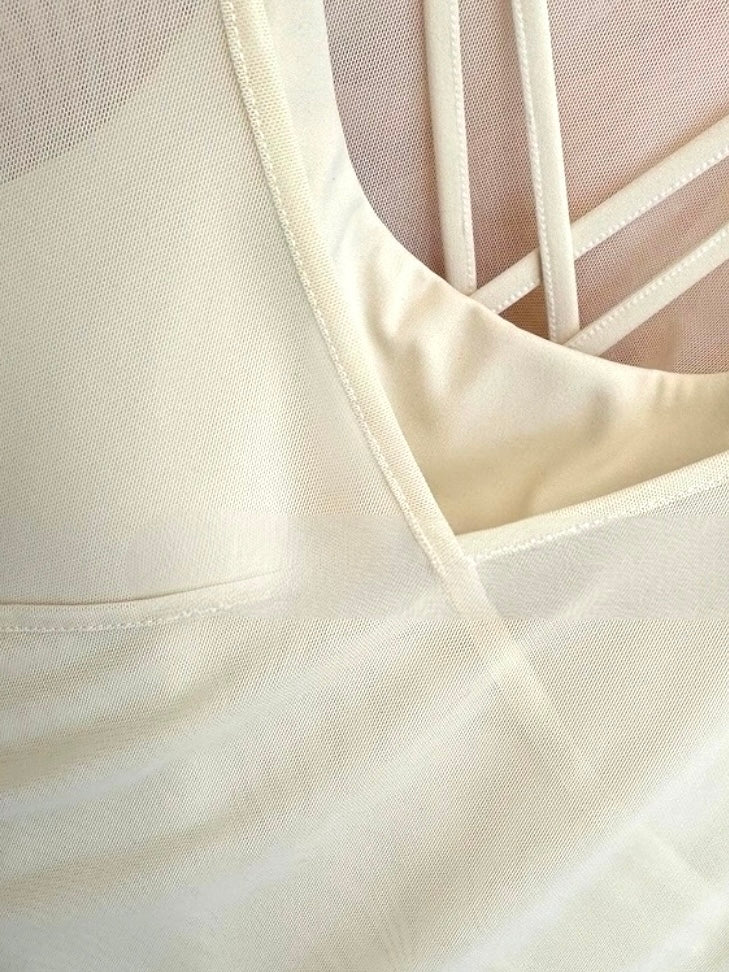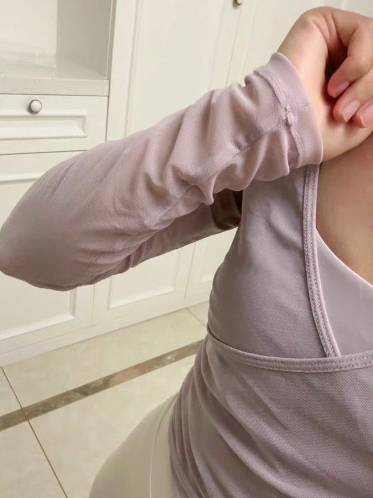 カップ付きブラトップがレイヤードデザインされたシアーメッシュで透け感のあるロングスリーブトップスと、スタイルアップ力抜群のフレアレギンスのセットです。