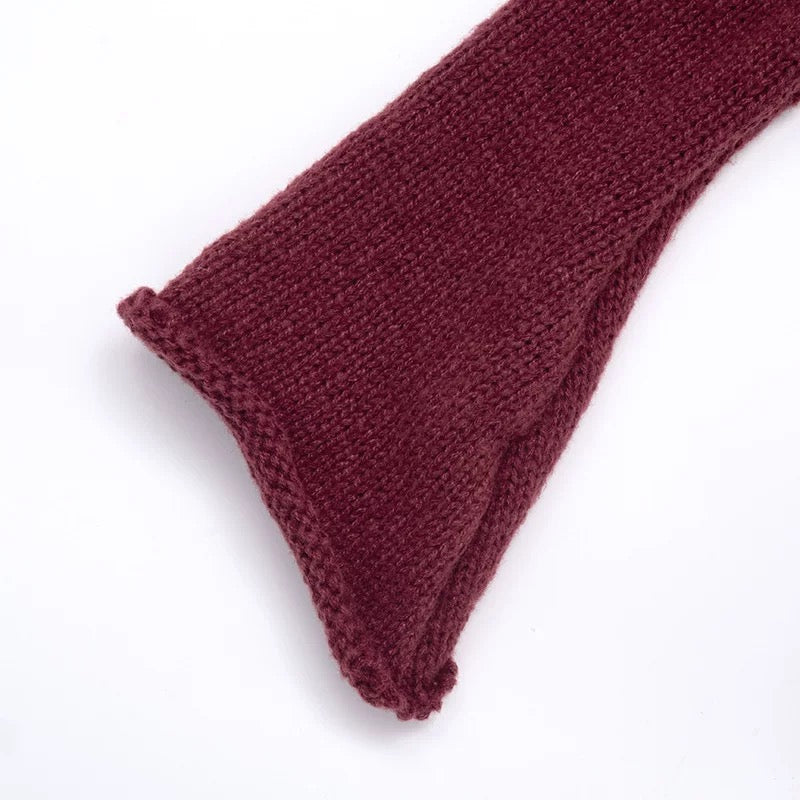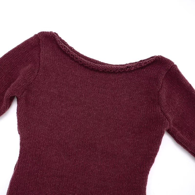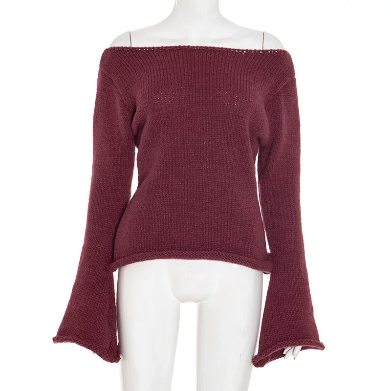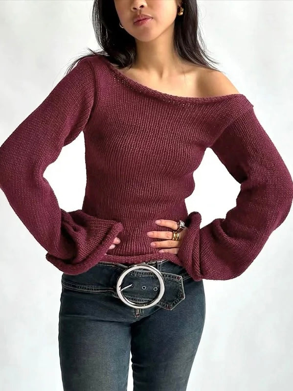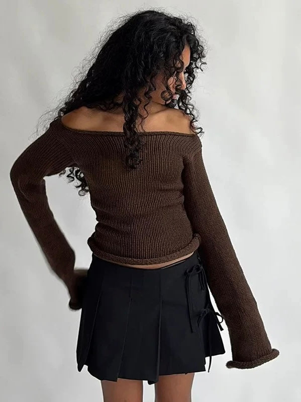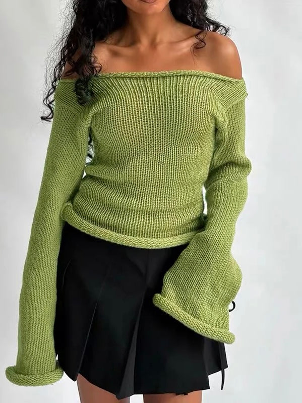 袖先、裾のカーリングデザインが立体感をつくり、長めのスリーブシルエットが女性らしい柔らかな印象を与えるニットは、オフショルダーで抜け感も演出。