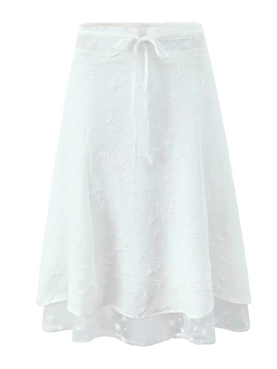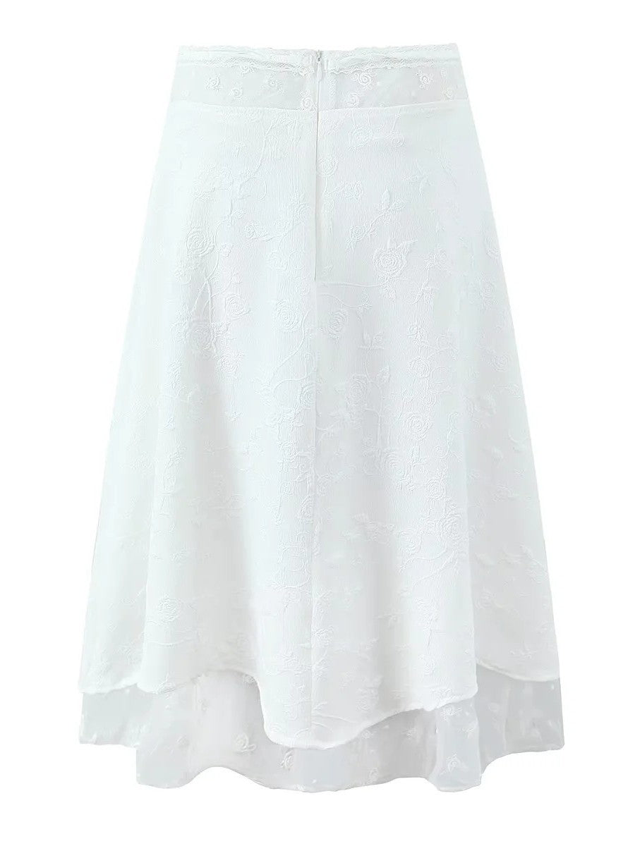 フラワー柄のレース素材でレイヤード風にデザインされたミディ丈のスカートは、フレアシルエットで動くたびに優雅になびくガーリームード溢れる1枚です。