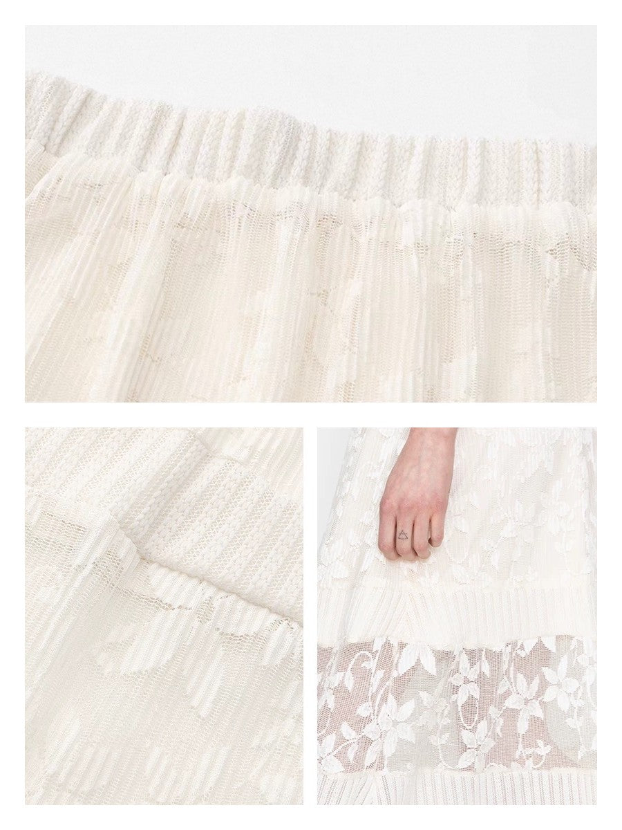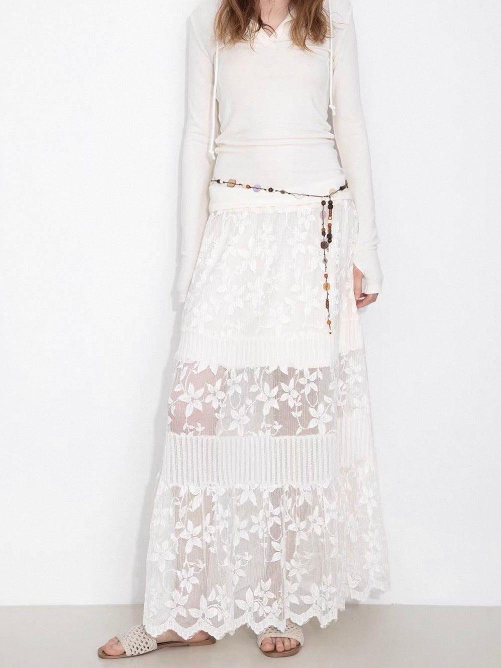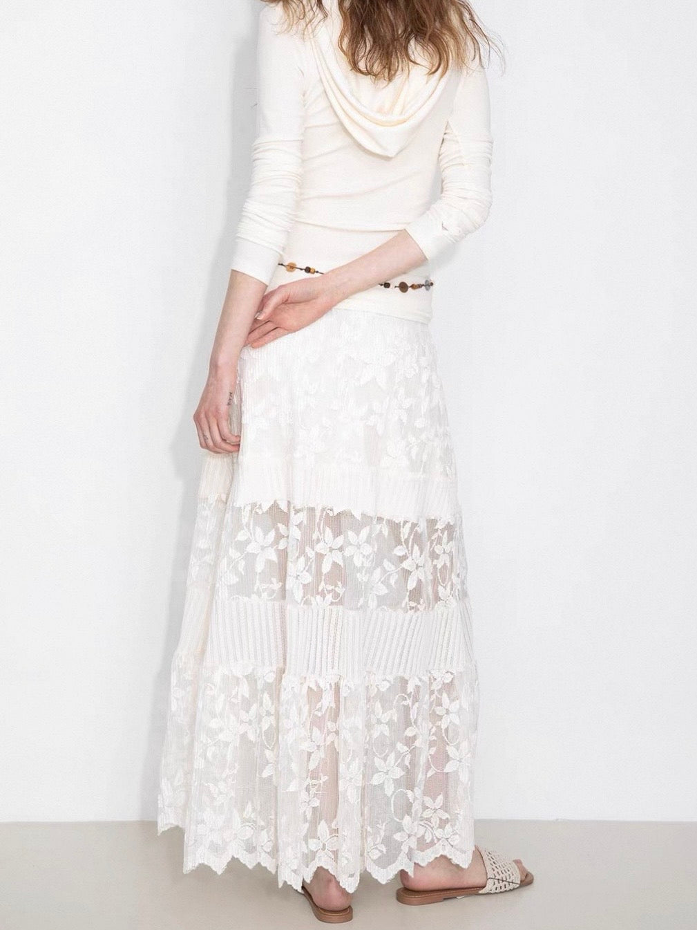 繊細なフラワーレースとニットライクなパネル切り替えが美しい、上品フェミニンなマキシ丈スカート。