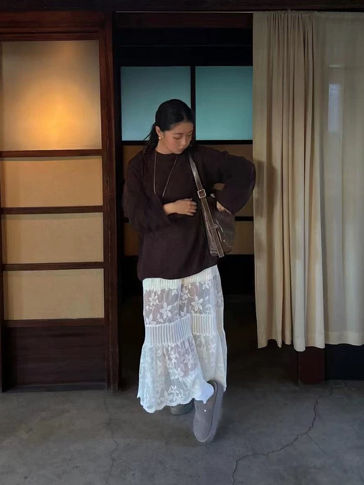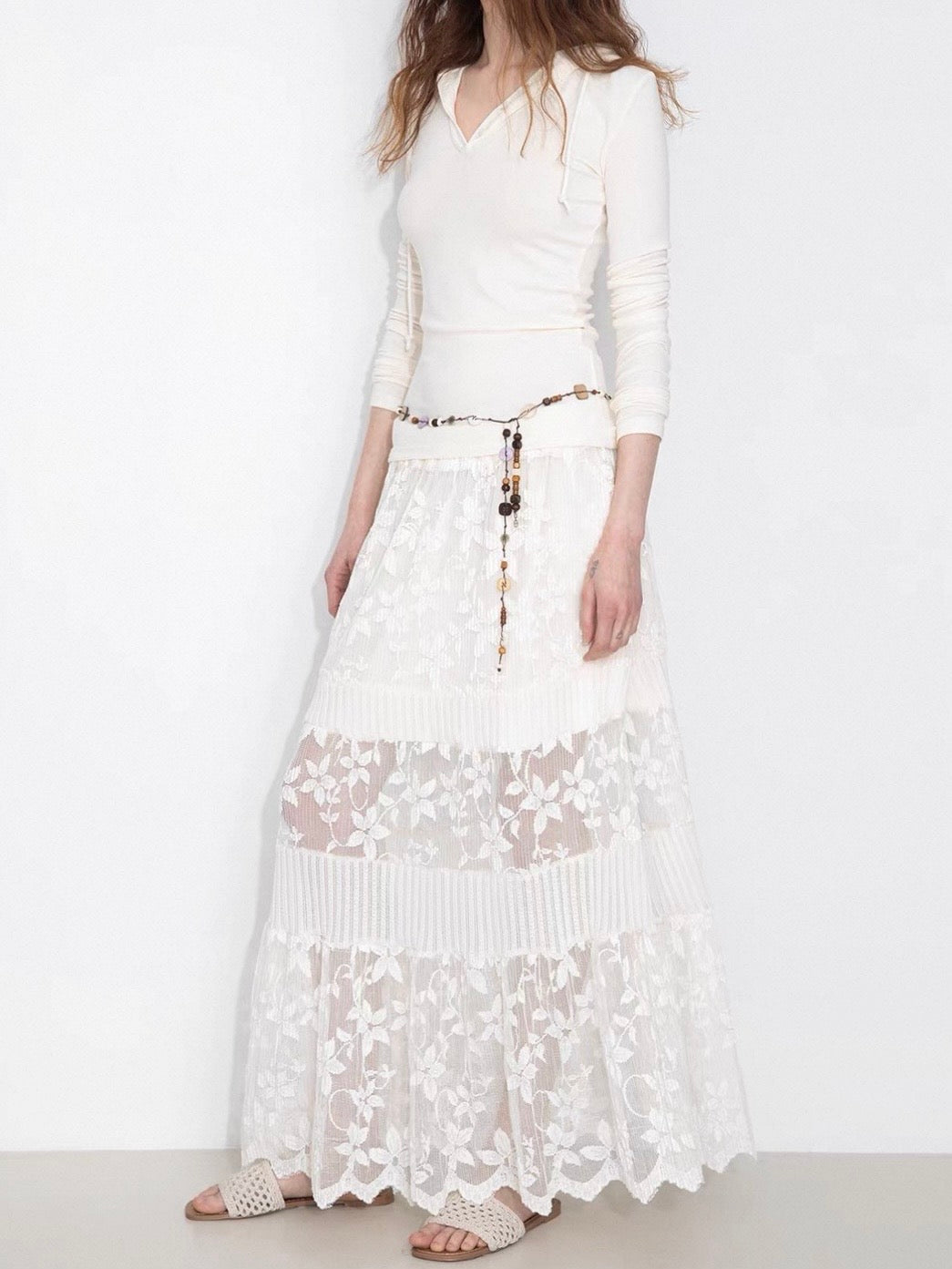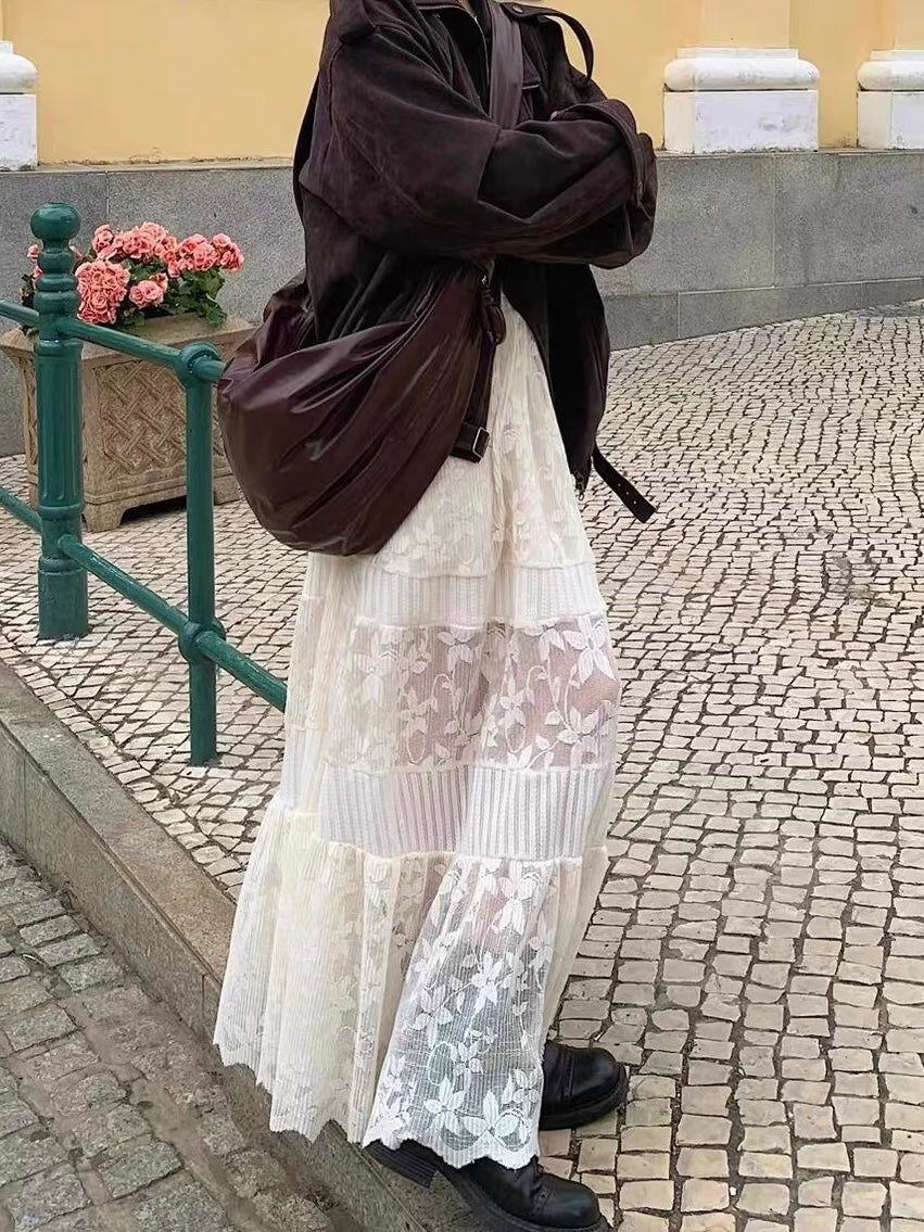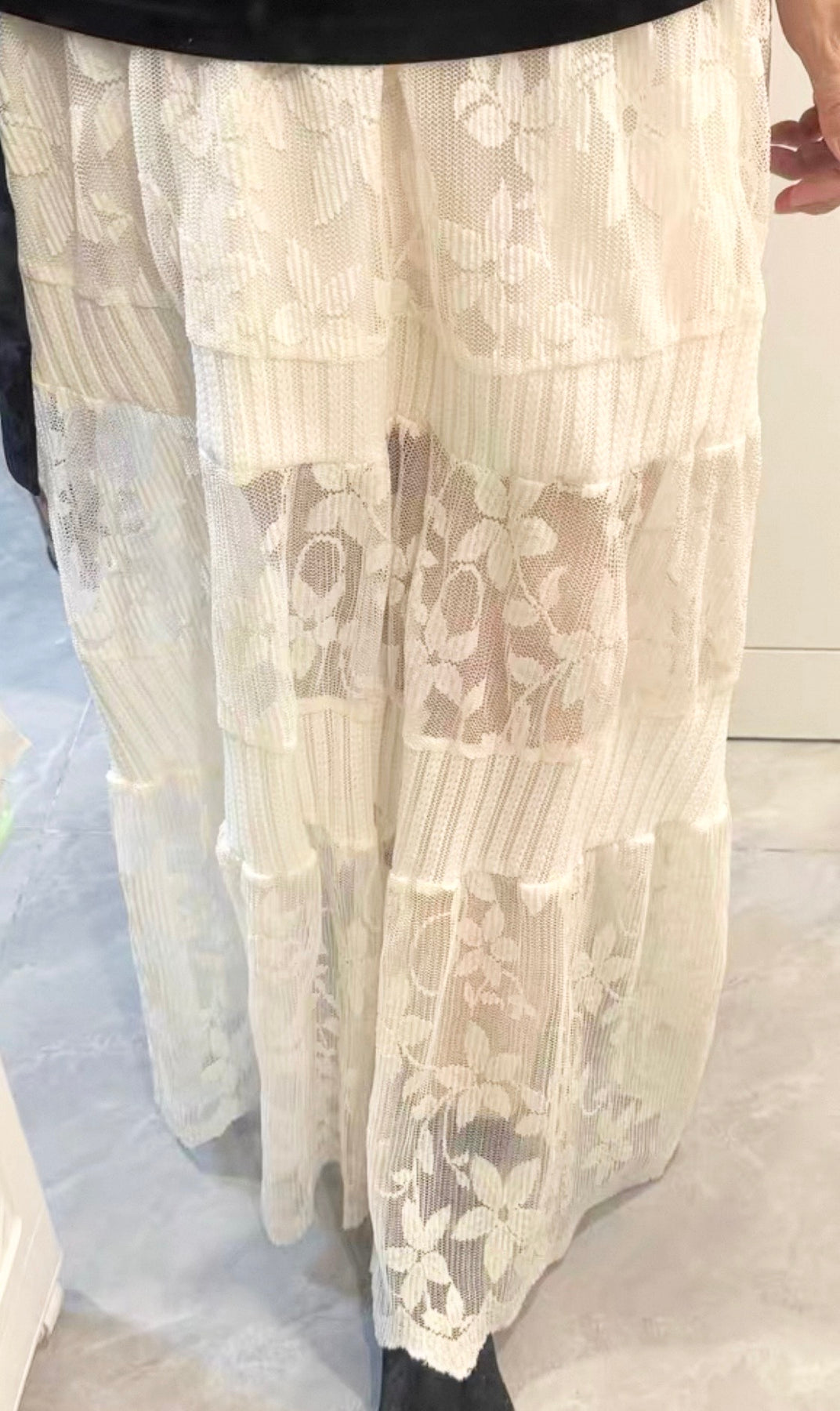 繊細なフラワーレースとニットライクなパネル切り替えが美しい、上品フェミニンなマキシ丈スカート。