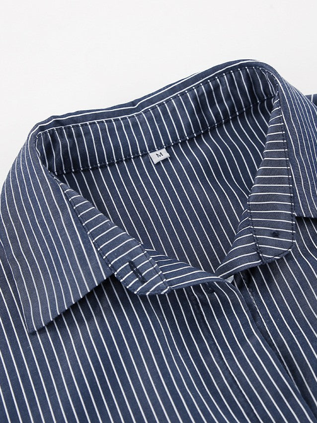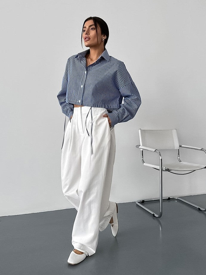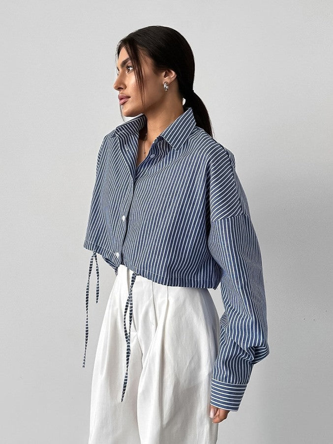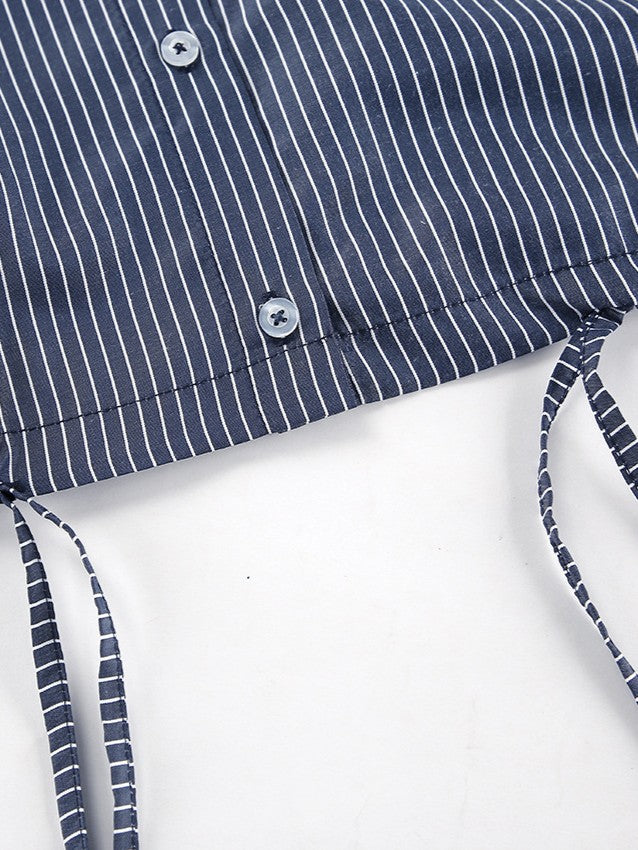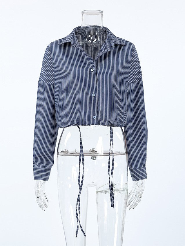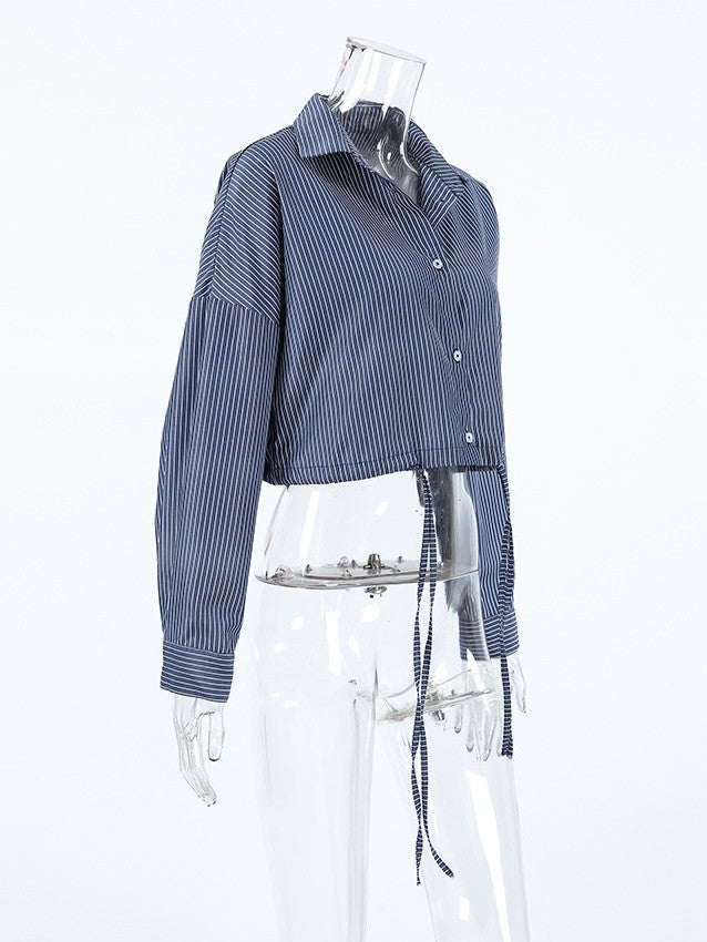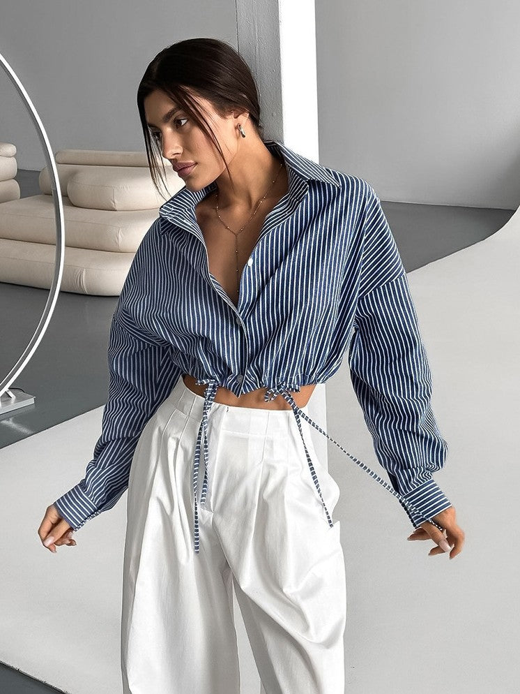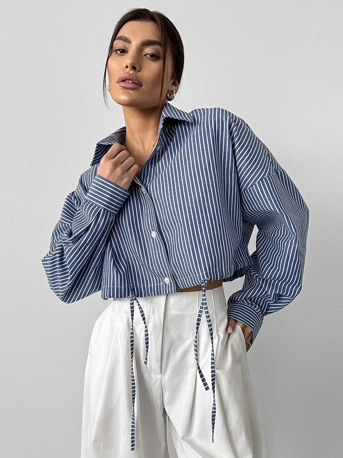 爽やかなストライプ柄のシャツは、裾が絞れるドローストリングデザインになっているので、すっきりしたシルエットで着用できます。