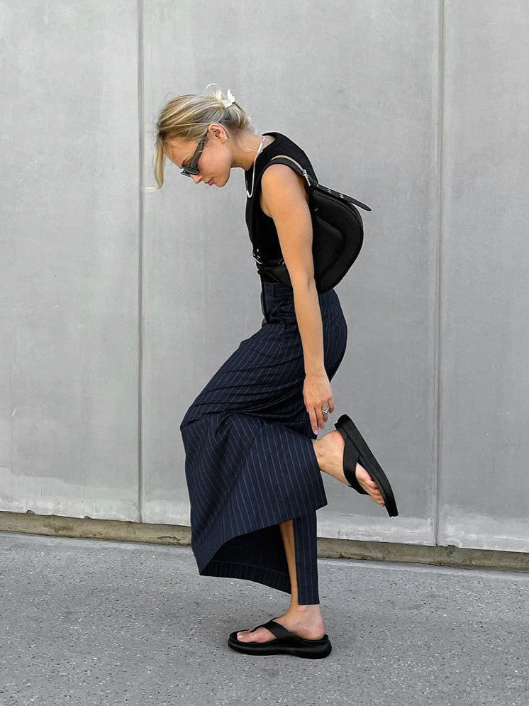 ハイウエストのストレートシルエットで脚長効果バッチリ!また、深めに入ったバックスリットで動きやすく、夏も涼しく着用できます。