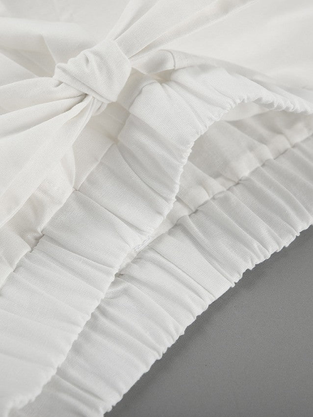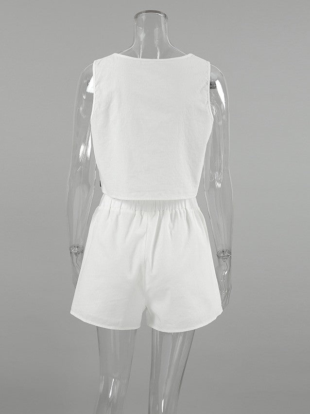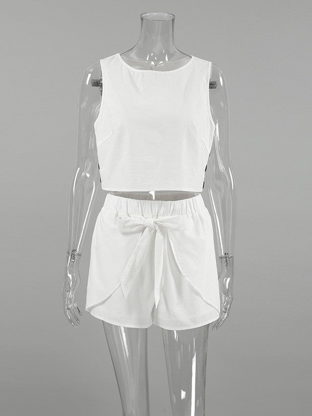 サイドのココナッツボタンがポイントのシンプルなタンクトップと、レイヤードデザインと大きなリボンがレディライクなショートパンツのセットです。