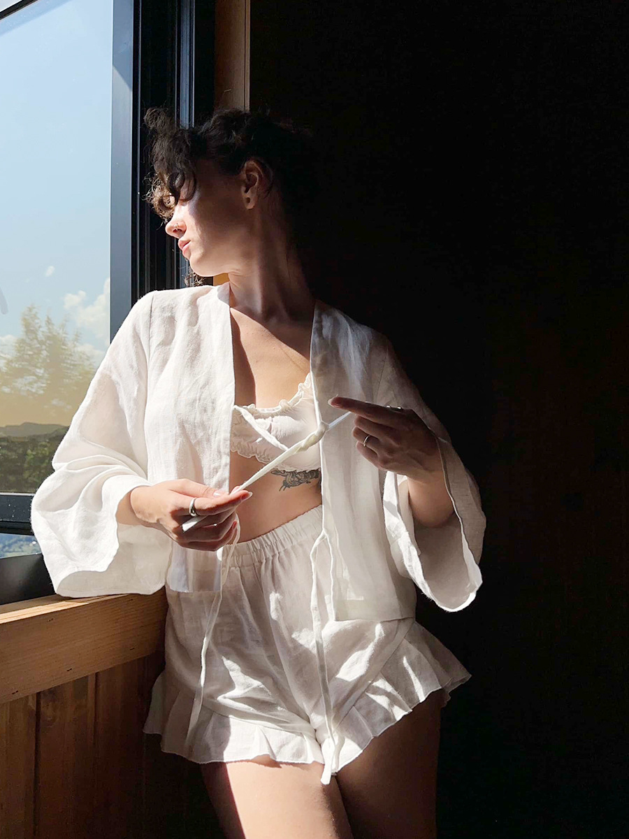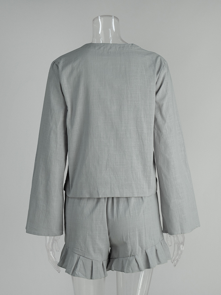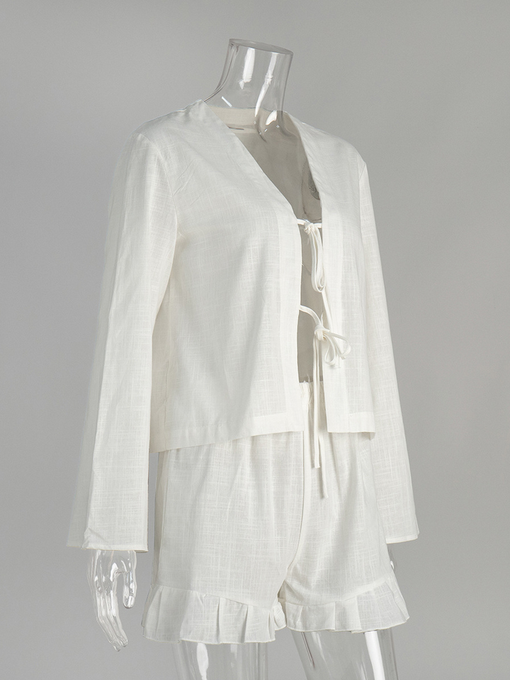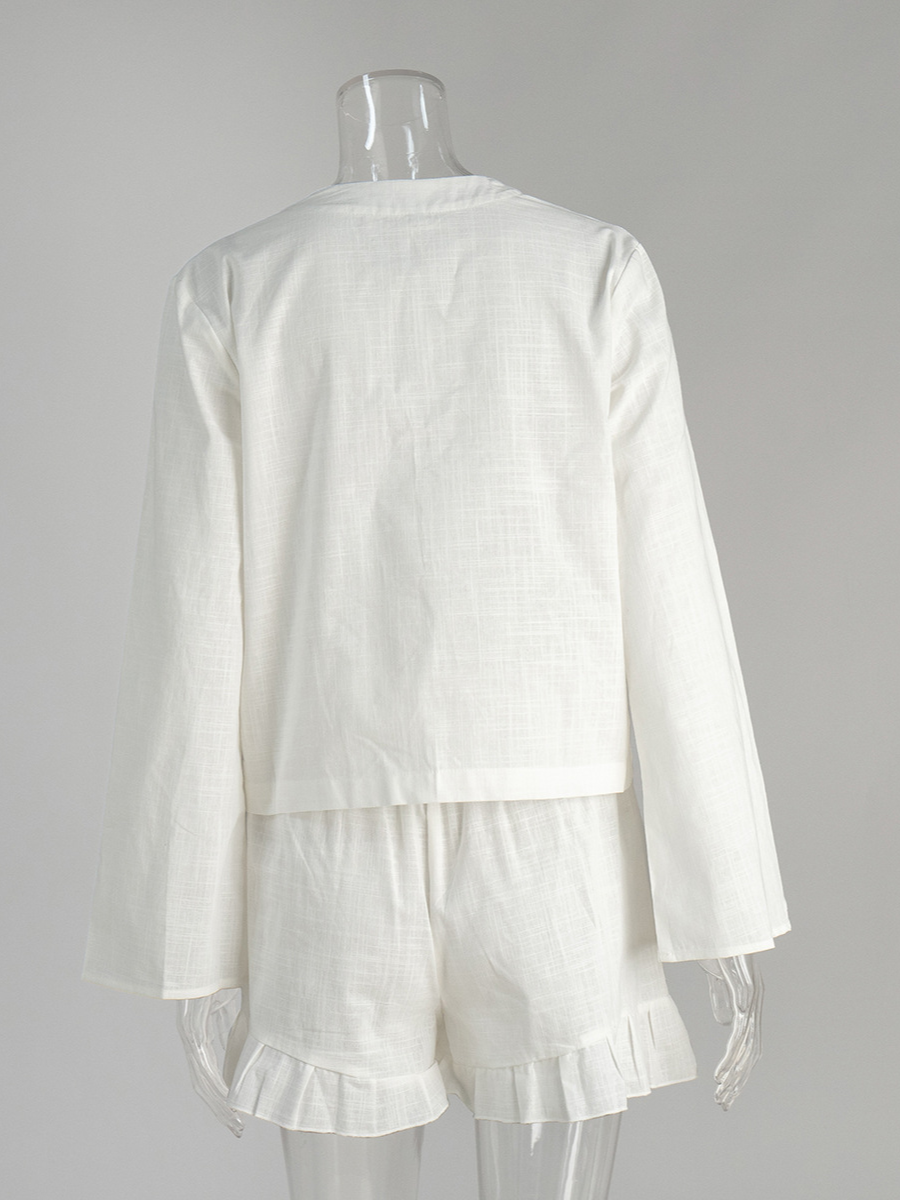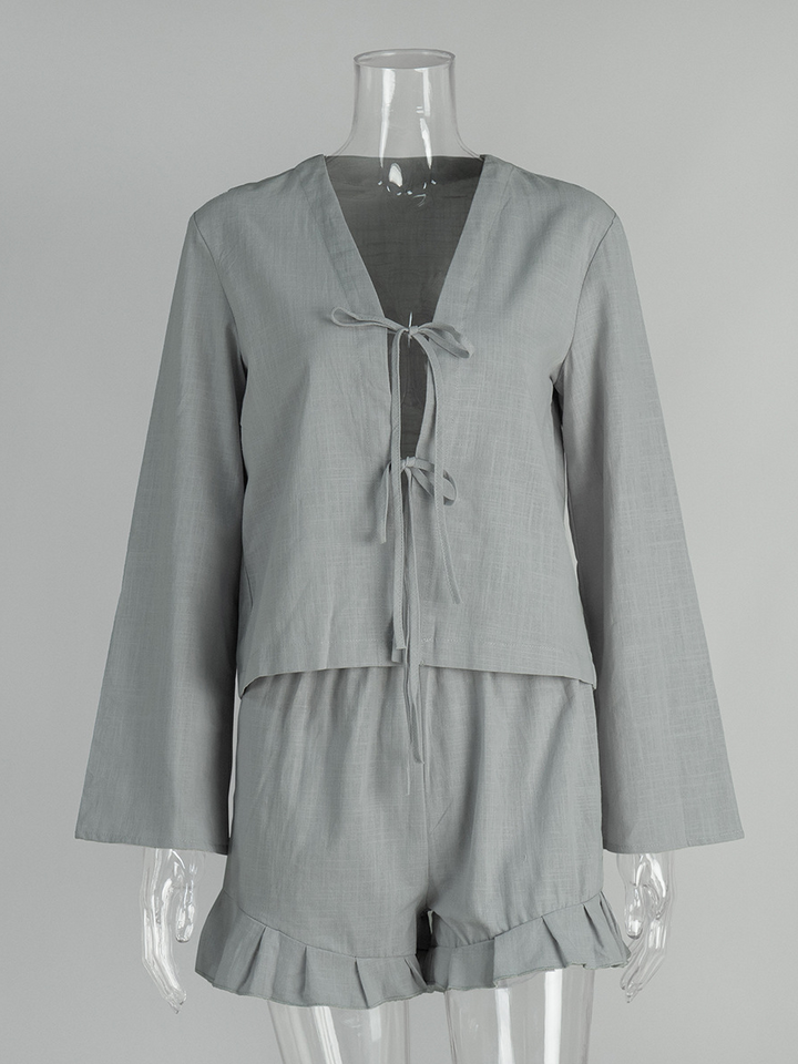 人気のレースアップシリーズに、ジャスト丈にワイドスリーブシルエットで腕が長く見えてスタイルアップ効果も◎ショートパンツはウエストゴム仕様で裾のフリルデザインが、ガーリームードもプラス。