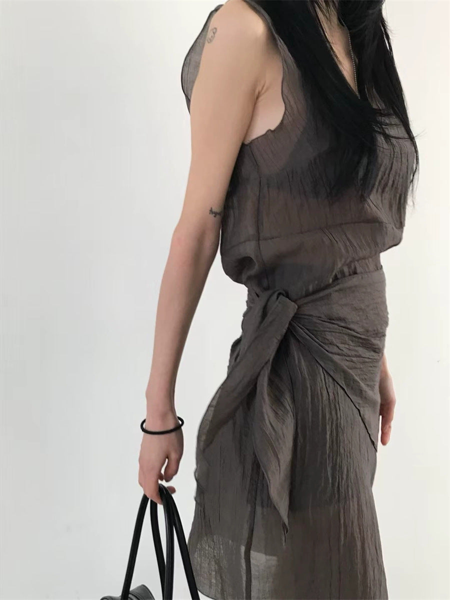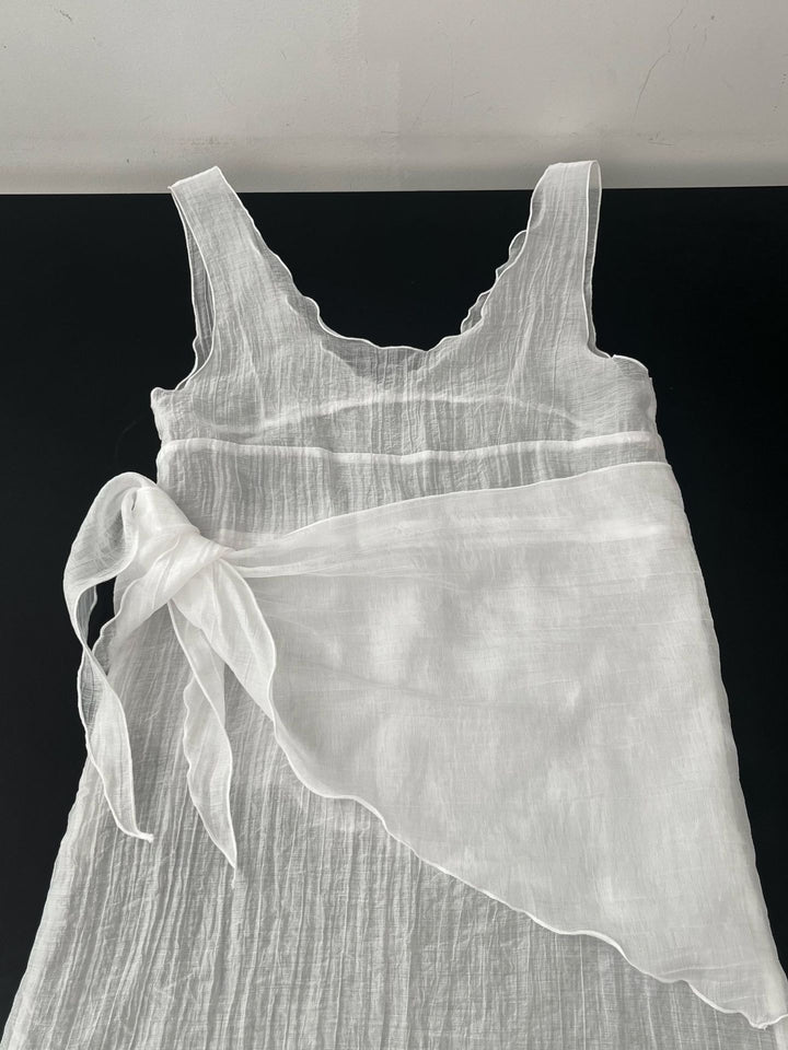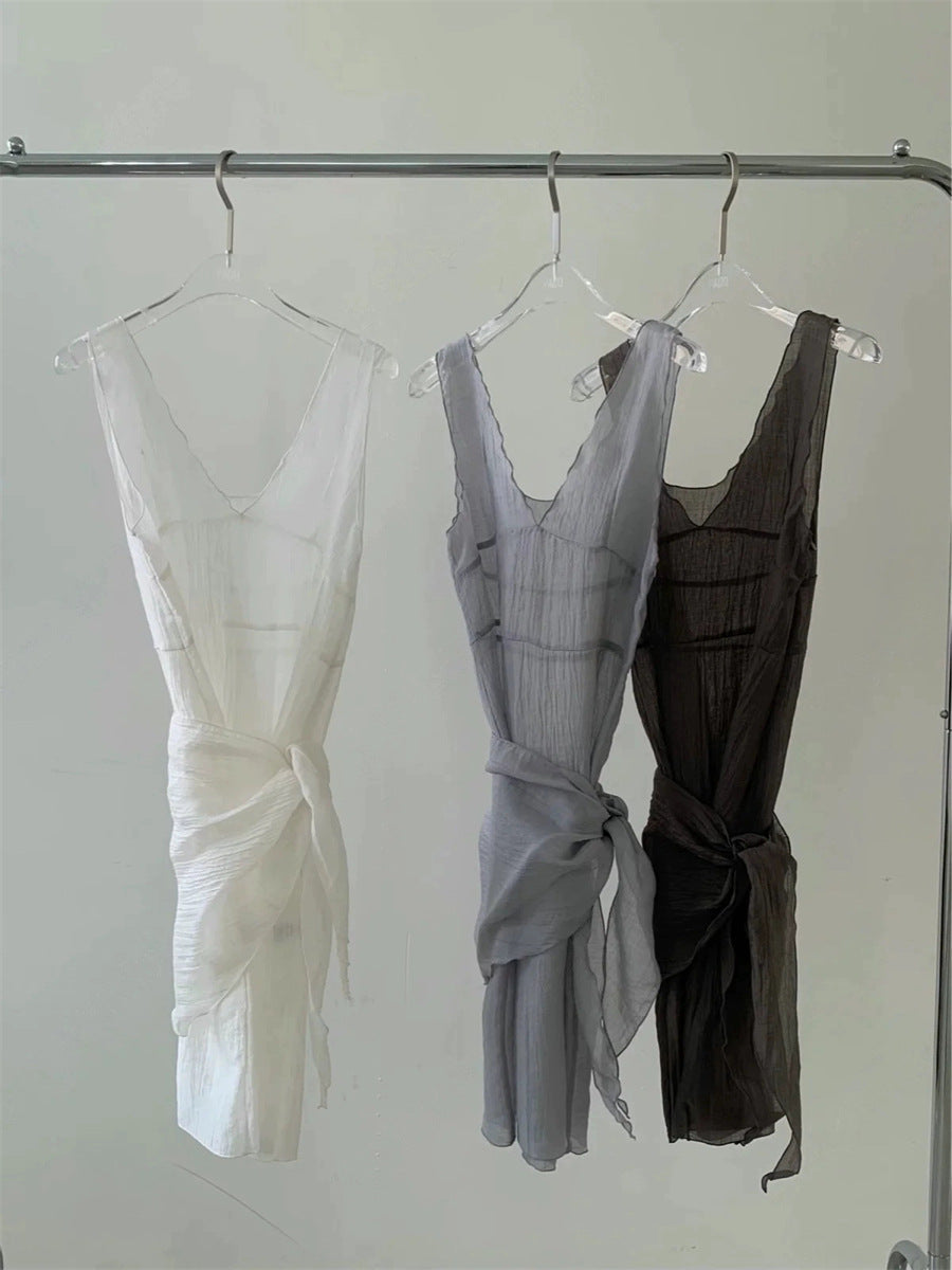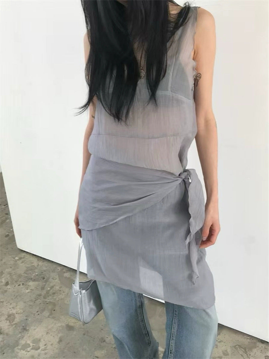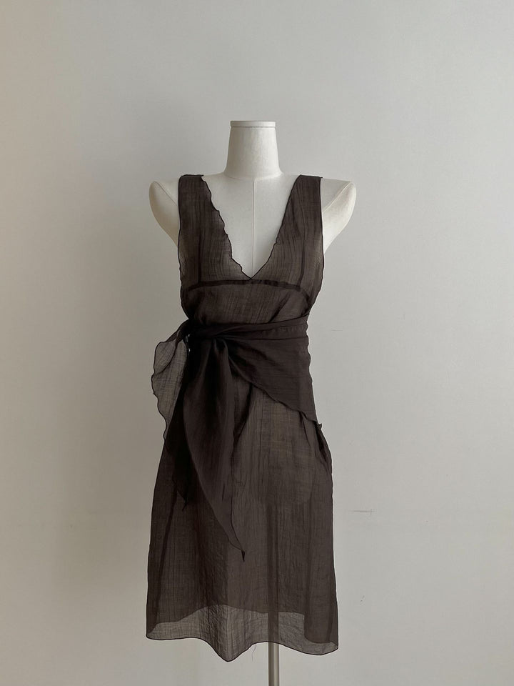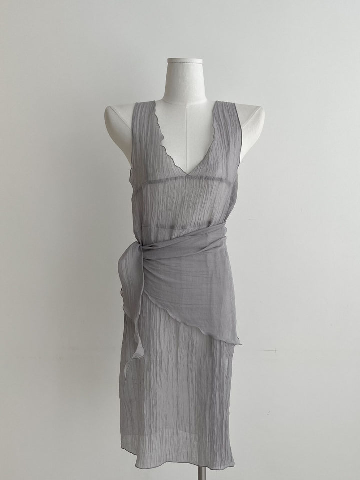 シアーな透け感がトレンドライクなワンピースは、スカーフもセットになっているので、スカーフをウエストに巻いたり、ビスチェのように胸に巻いたりなど、アレンジ次第でいろいろな表情を楽しめます。