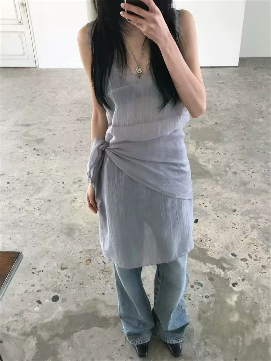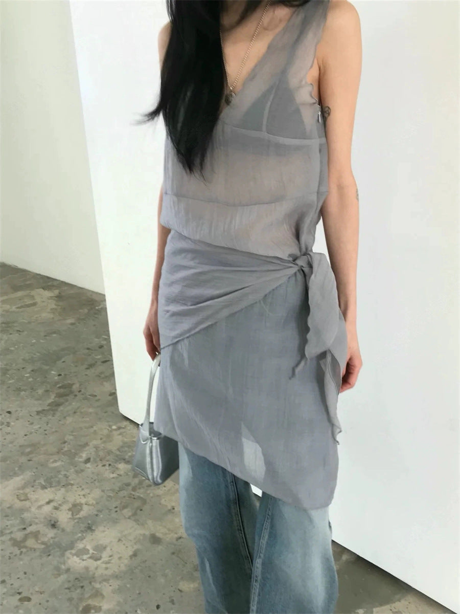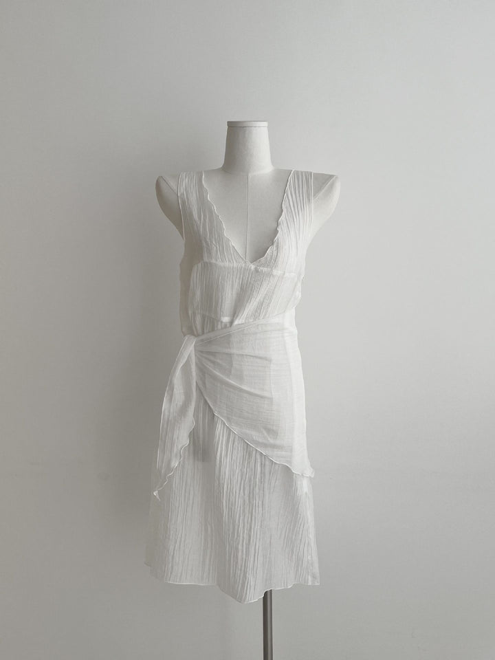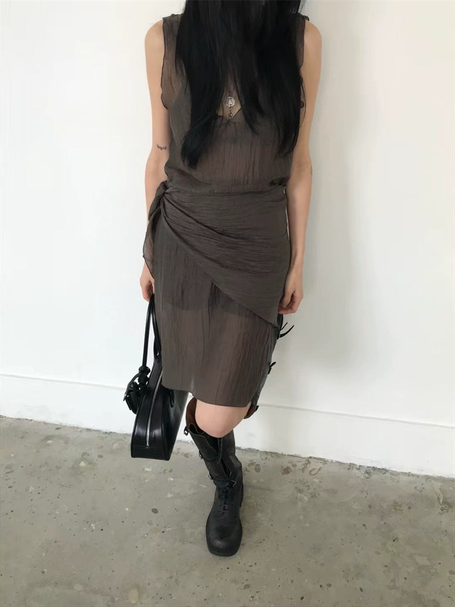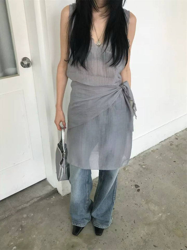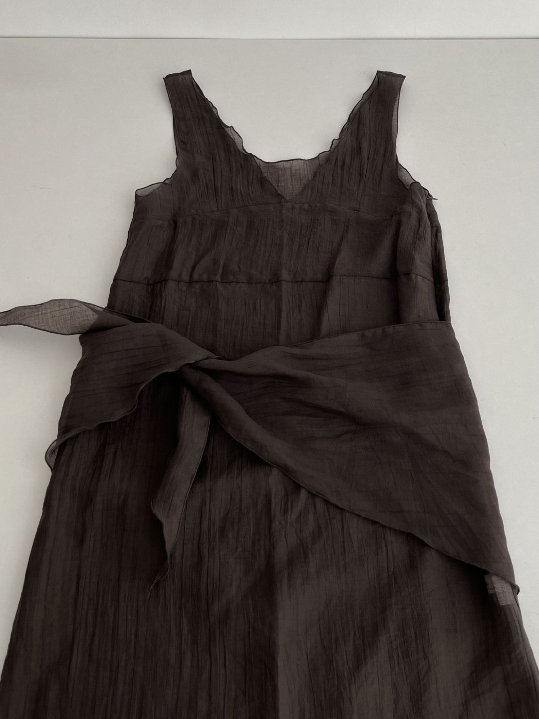 シアーな透け感がトレンドライクなワンピースは、スカーフもセットになっているので、スカーフをウエストに巻いたり、ビスチェのように胸に巻いたりなど、アレンジ次第でいろいろな表情を楽しめます。
