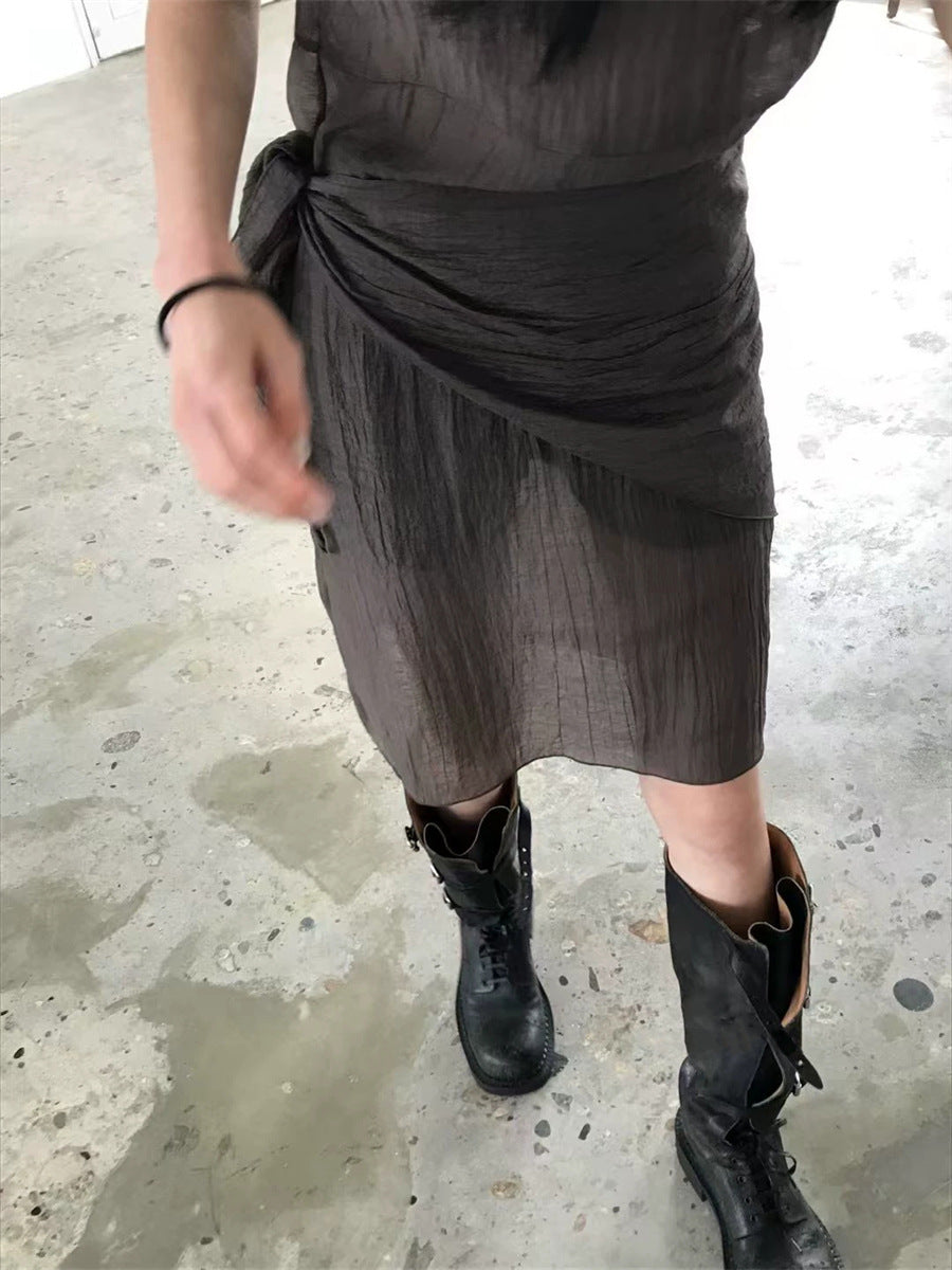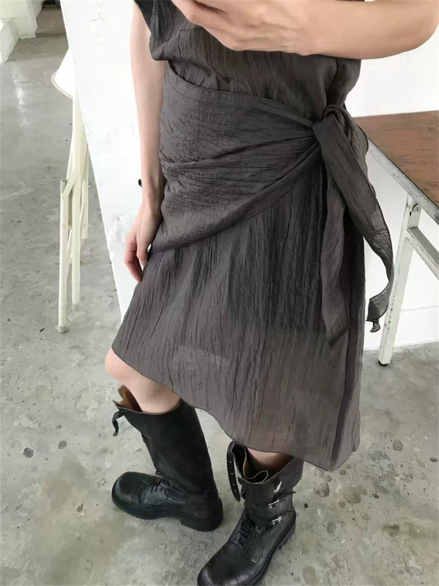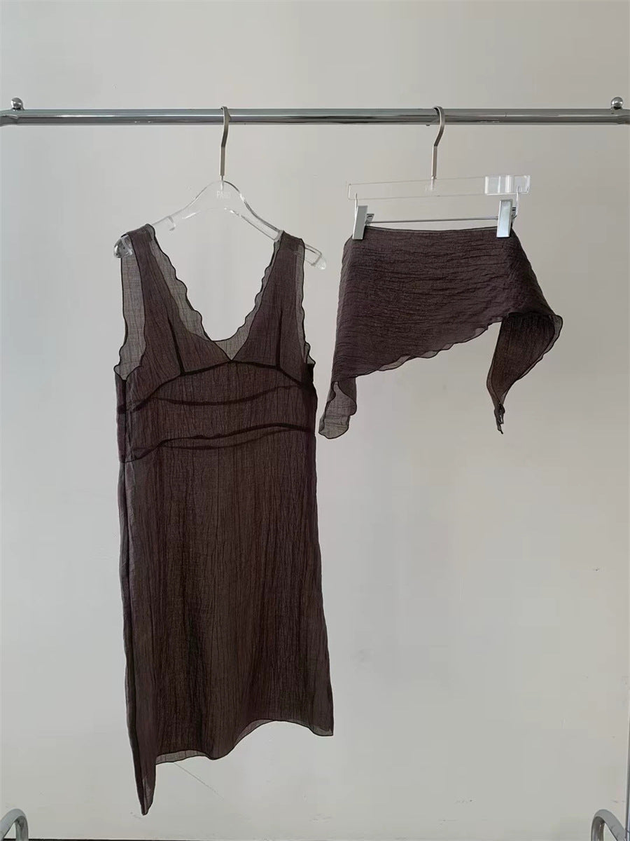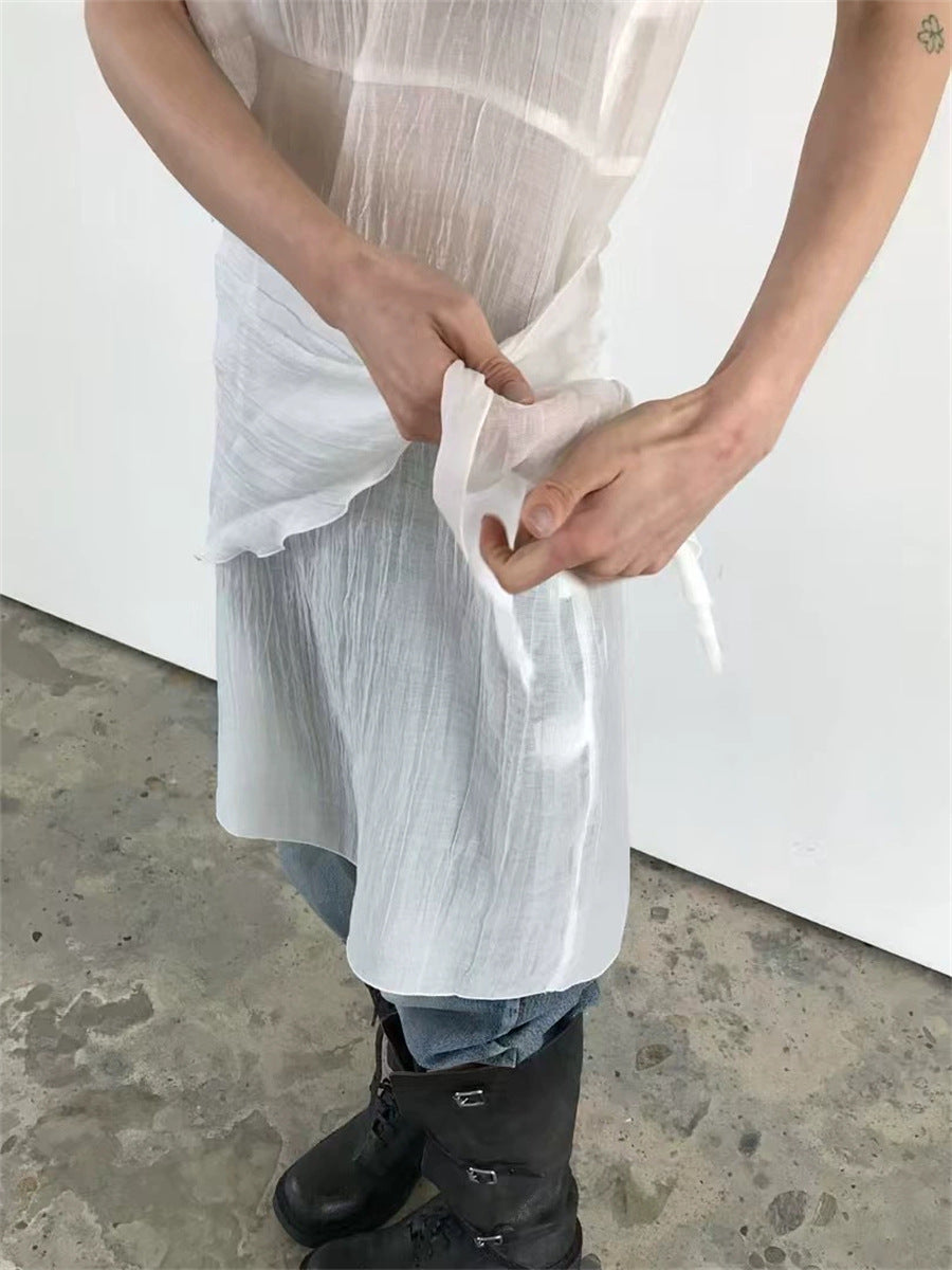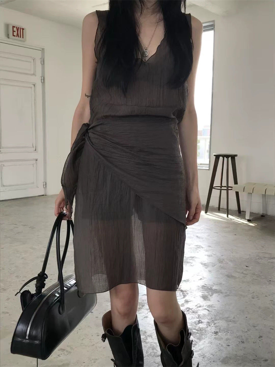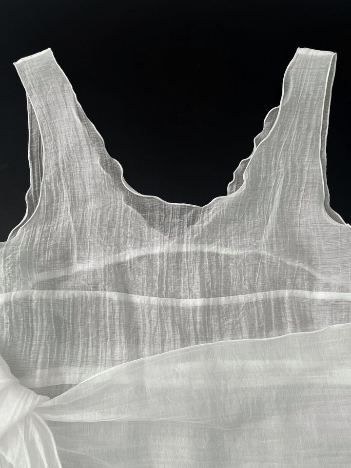 シアーな透け感がトレンドライクなワンピースは、スカーフもセットになっているので、スカーフをウエストに巻いたり、ビスチェのように胸に巻いたりなど、アレンジ次第でいろいろな表情を楽しめます。