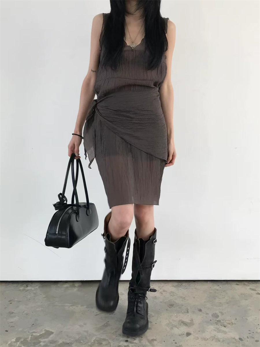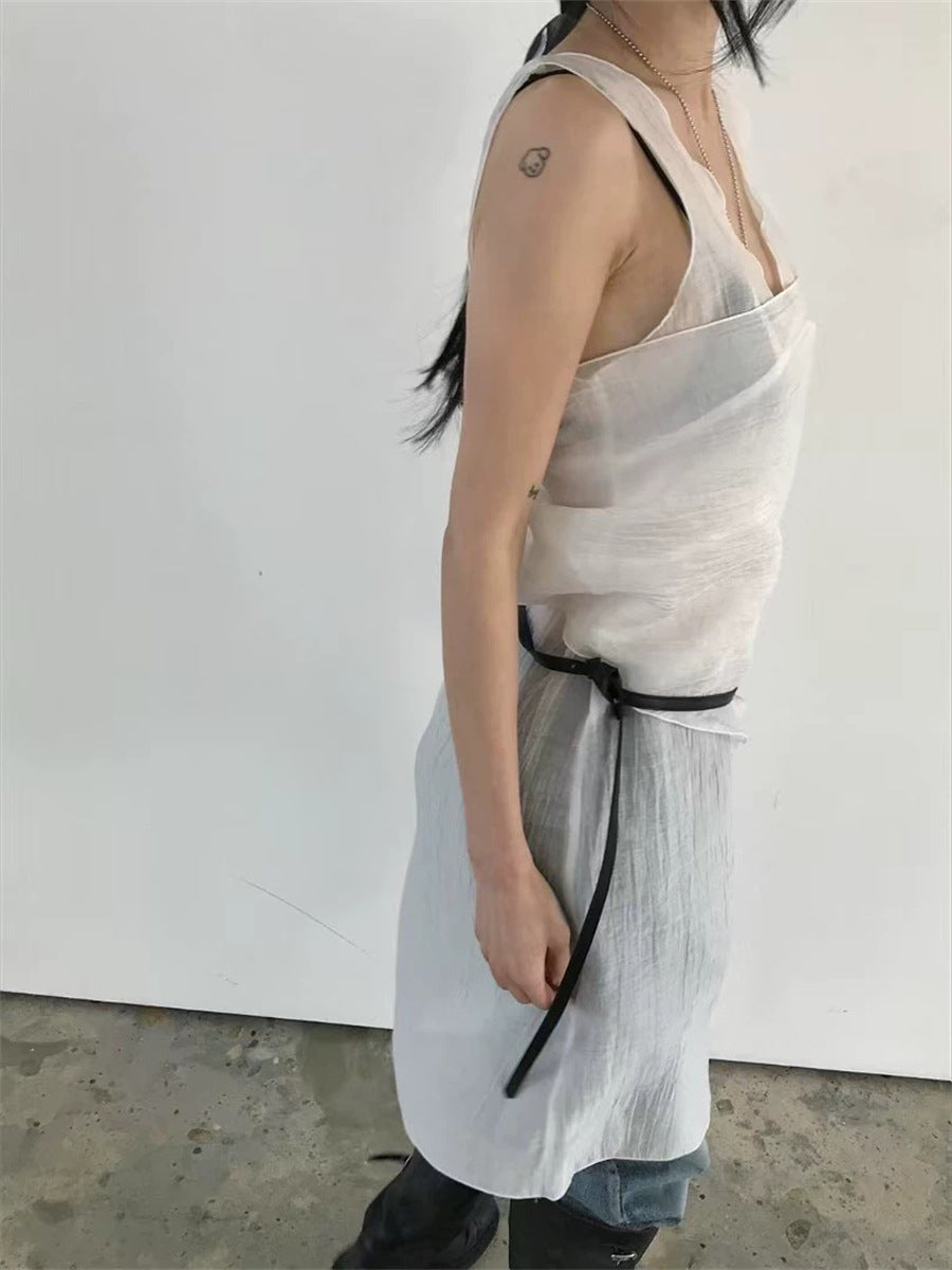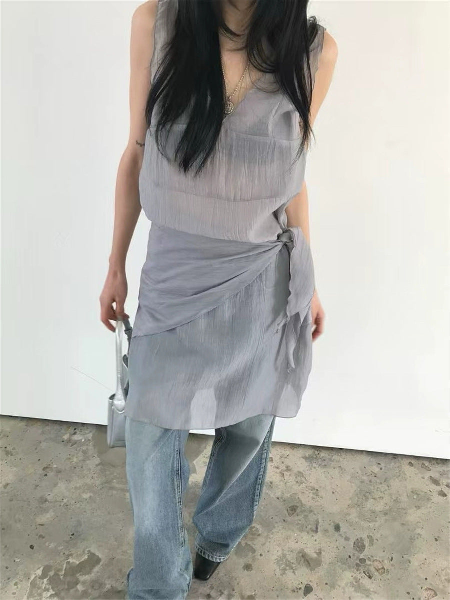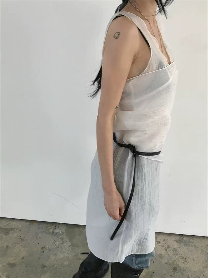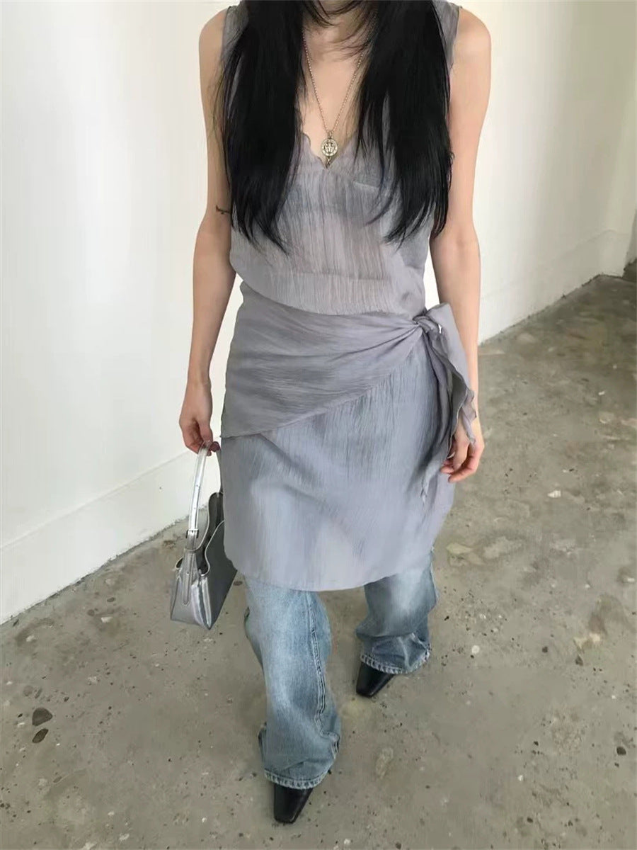 シアーな透け感がトレンドライクなワンピースは、スカーフもセットになっているので、スカーフをウエストに巻いたり、ビスチェのように胸に巻いたりなど、アレンジ次第でいろいろな表情を楽しめます。