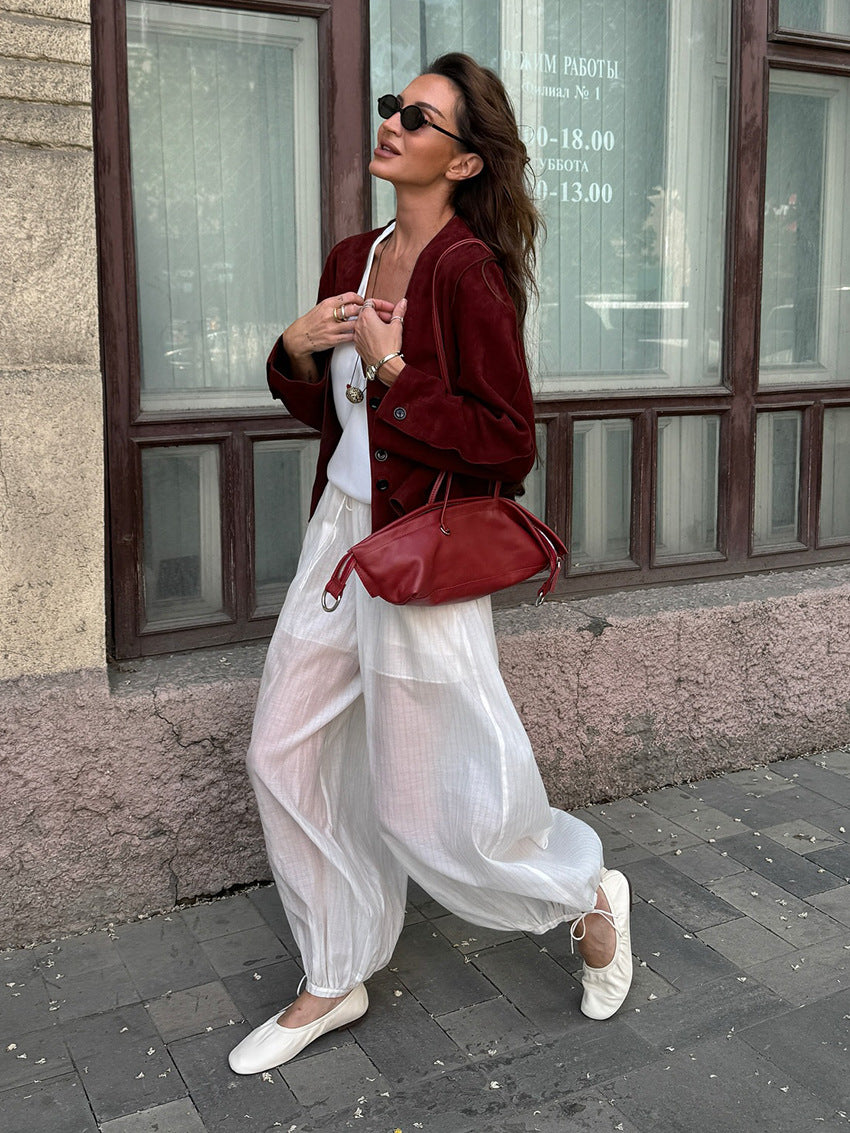 ボリューム感のあるシルエットですが、シアーな透け感で、軽やでエアリーなイージーさが魅力のパンツ。