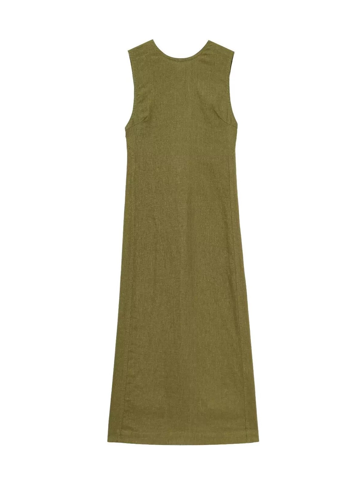 落ち着いたオリーブカラーが目を惹く、綿麻素材のロングワンピース。