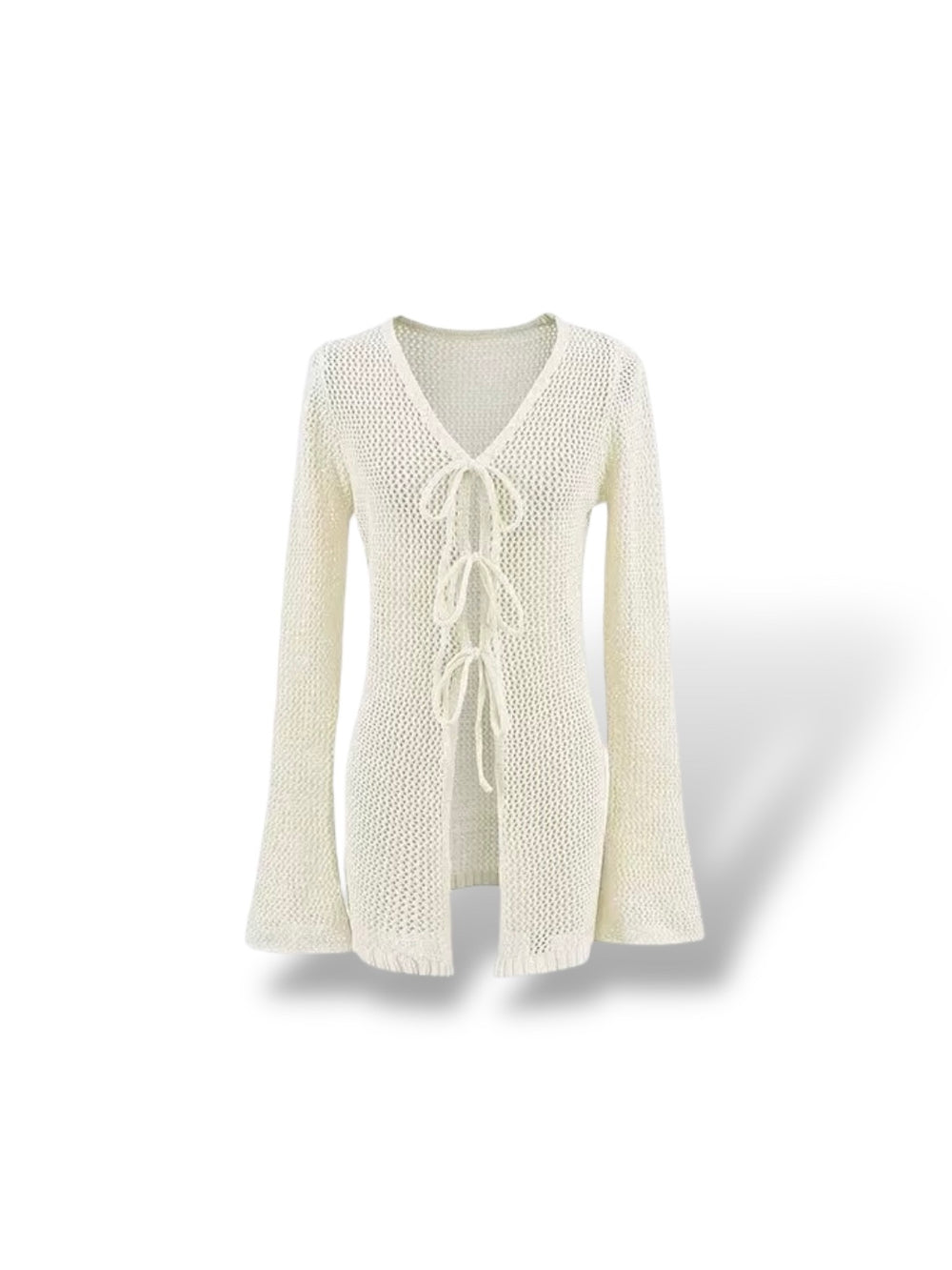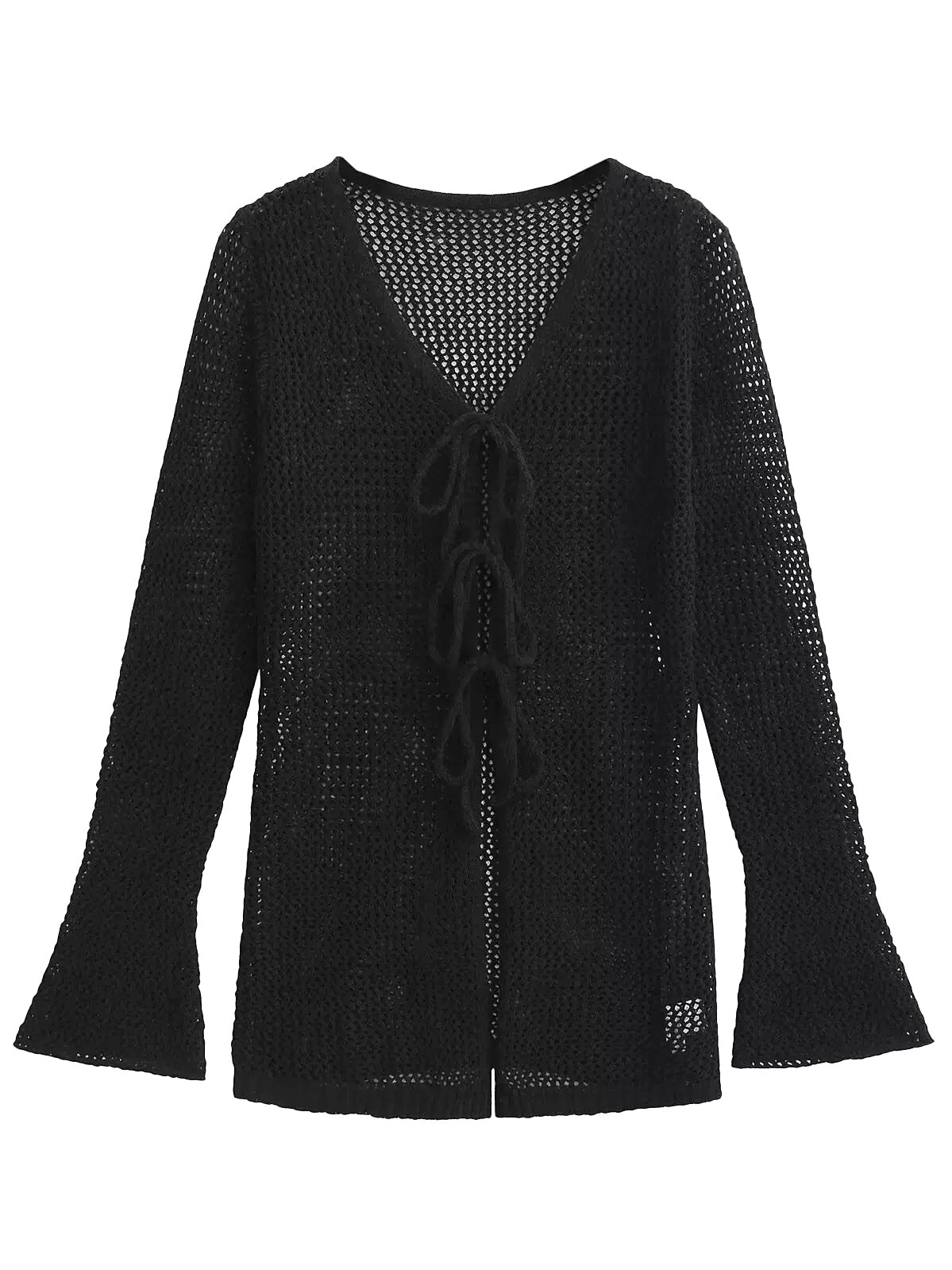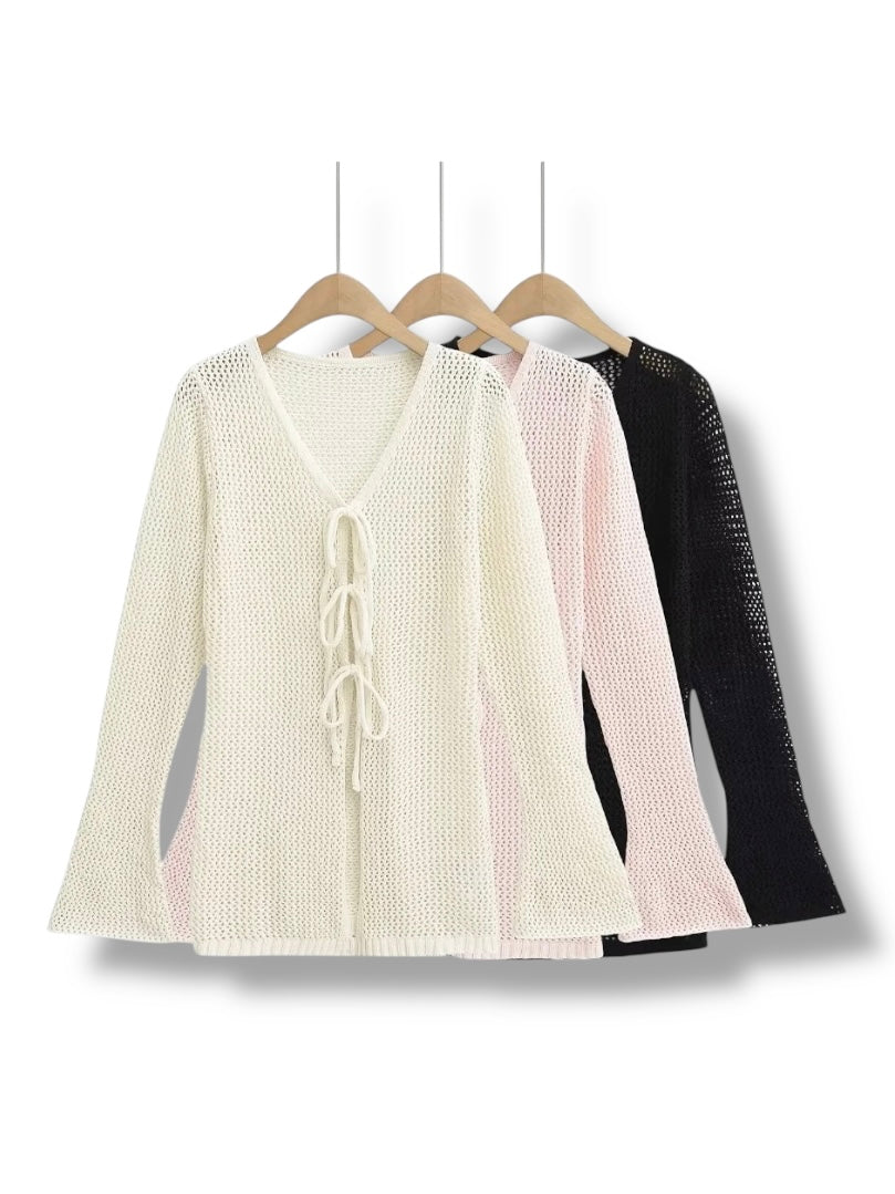 程よい透け感が魅力のメッシュ編みカーディガン。フロントのレースアップデザインが縦ラインを強調し、スタイルアップ効果も叶える1枚です。